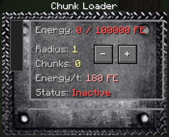 Загружайте чанки с помощью электричества, изменяйте радиус и другие параметры в интерфейсе chunkloader'а.