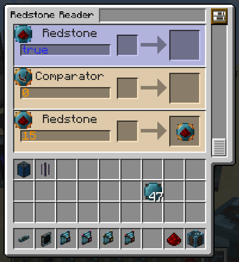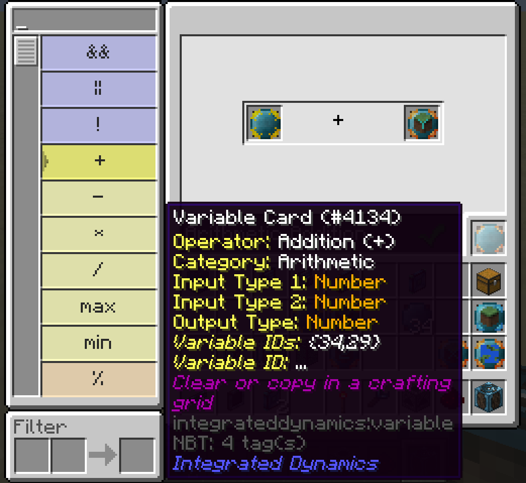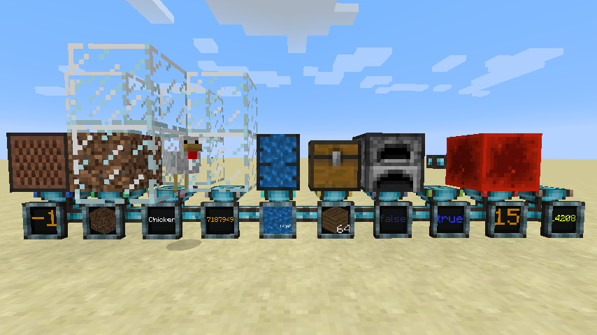 Рецепты являются полноценными объектами в Integrated Dynamics. Вы можете определить их самостоятельно в Программаторе Логики или читать их динамически из машин с помощью Считывателя Машин (Machine Reader). Рецепты широко используются в моде Integrated Crafting.