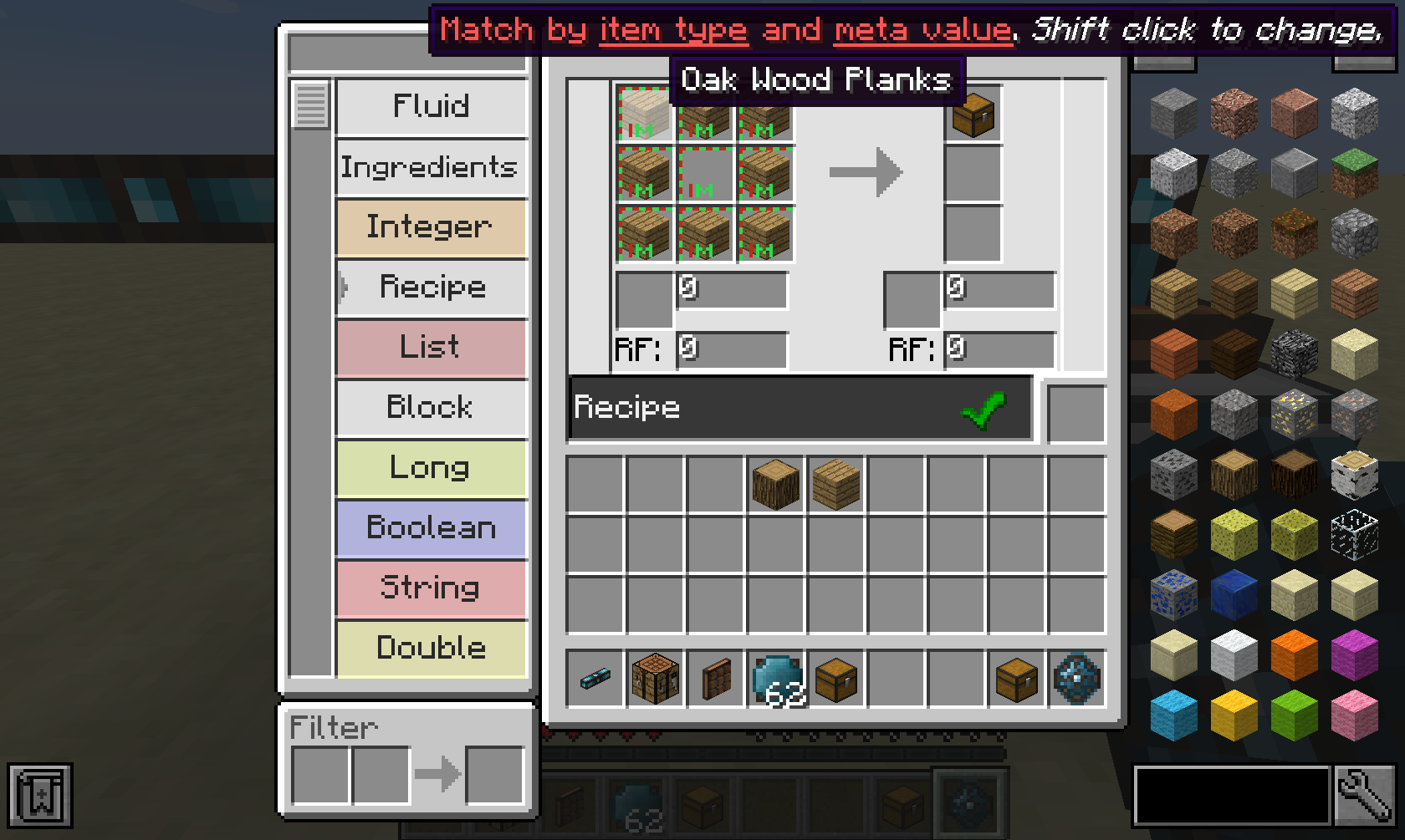 С помощью такой Логики Рецептов вы можете создавать сложные логические системы, например, систему, которая ищет рецепт для заданного предмета.