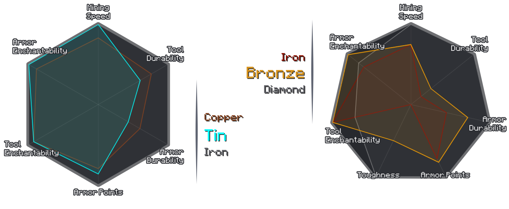 Железные слитки имеют множество различных ролей в ванильном Minecraft. Они могут использоваться для брони, оружия, инструментов, поршней, цепей, нажимных плит и около 35 других рецептов. Хотя я не хочу, чтобы бронза была настолько же полезной, как железо, так как считаю, что это слишком лишит железо его доминирования в средней игре как полезного материала, я хочу добавить некоторые уникальные функции, которые завершат этот материал.