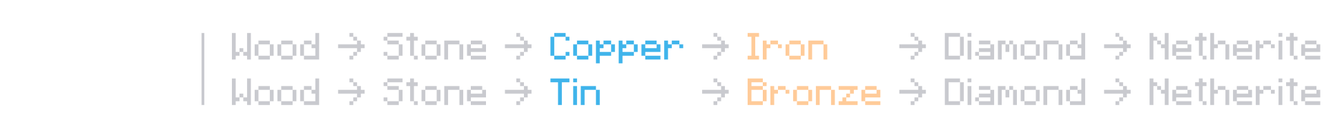 Оловянные инструменты имеют прочность 151 по сравнению с 191 у медных, и на 1 единицу больше скорости копания. Все остальные характеристики одинаковы. Это ставит оловянные инструменты на тот же уровень скорости копания, что и железные/бронзовые.