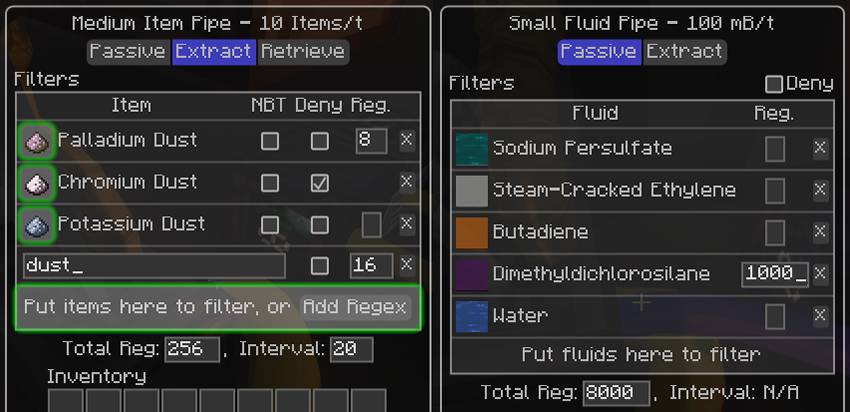 Как трубы для предметов, так и трубы для жидкостей могут фильтровать и регулировать количество хранимого в подключенном инвентаре. Трубы для предметов могут либо активно выталкивать предметы к другим концам труб (Извлечение), либо активно забирать предметы из других концов труб (Получение).