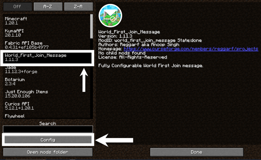 Найдите World First Join Message и нажмите Настроить (если используете ModMenu или встроенный GUI конфигурации Forge).