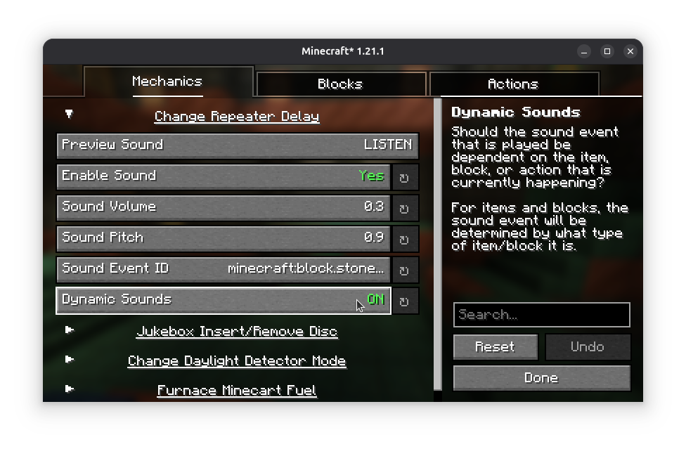 • Высокая степень настройки, вы можете изменять используемые звуковые события и даже настраивать динамические звуки блоков и предметов через ресурс-паки, что особенно полезно для создания аддонов к модам с контентом.