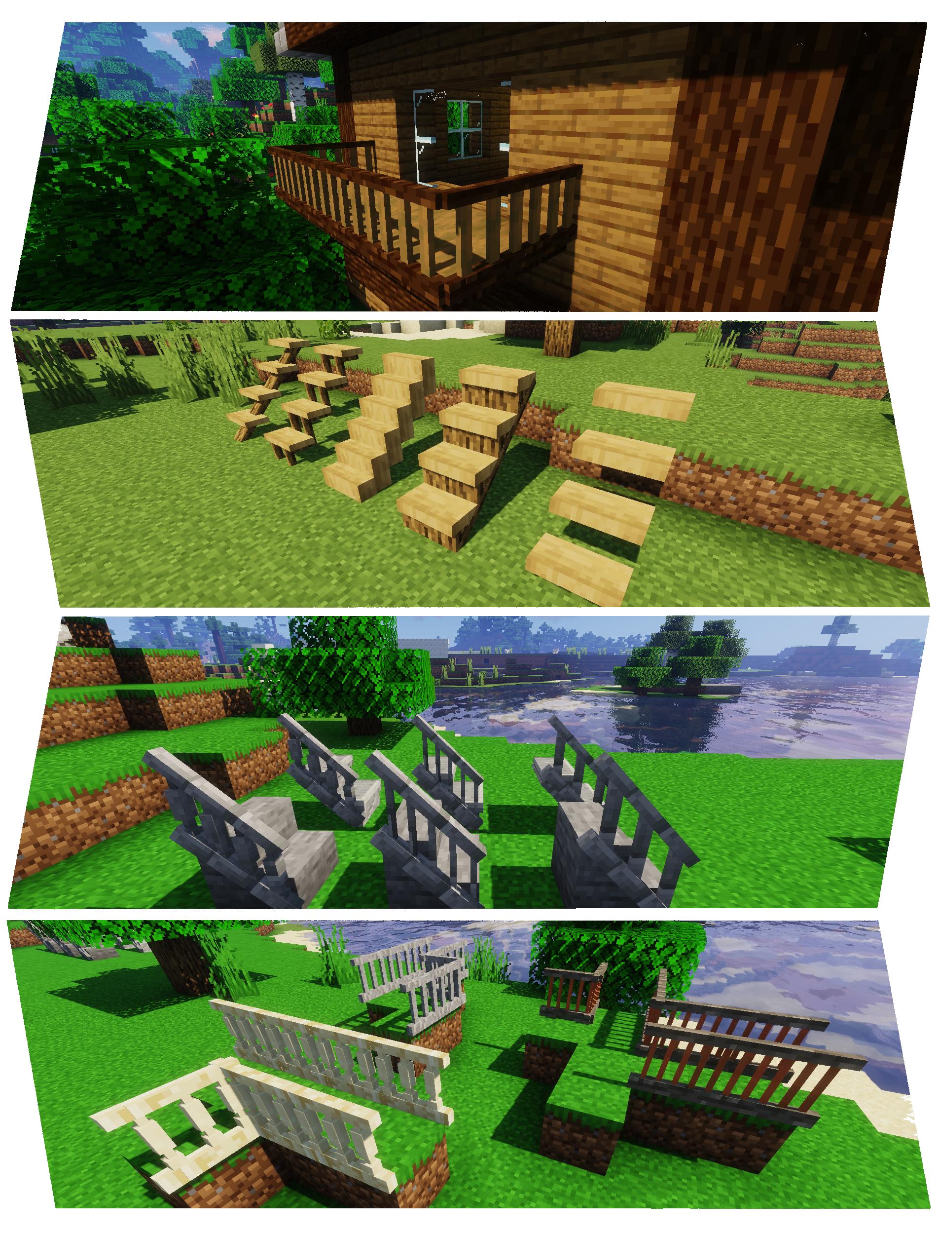 Этот мод даёт ответ на этот вопрос! Теперь вы можете добавить перила к ванильным или модифицированным лестницам и даже изменить их стиль,
