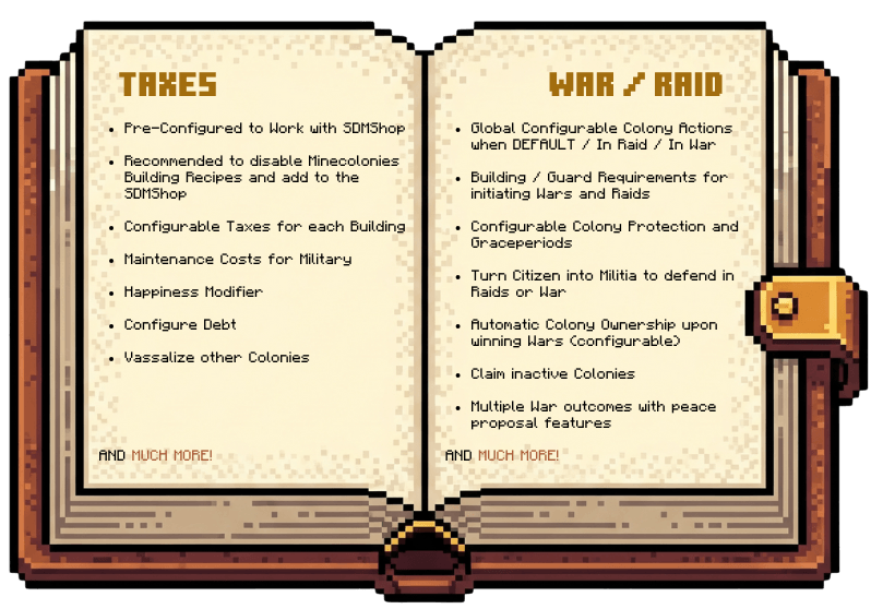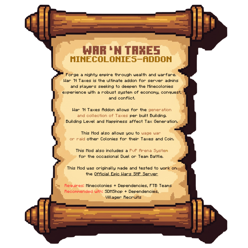 War 'N Taxes (ранее MinecolonyTax) — это аддон, созданный для разработчиков модпаков, который революционизирует геймплей MineColonies, внедряя всеобъемлющую систему налогообложения, полностью настраиваемую механику войны и рейдов, функции вассализации и гибкие варианты валюты. Первоначально разработанный для сервера EpicWars SMP, этот мод теперь также включает простую настройку PvP арен, мирные переговоры и экономические штрафы — всё интегрировано с SDMShop для оптимизированного управления валютой.