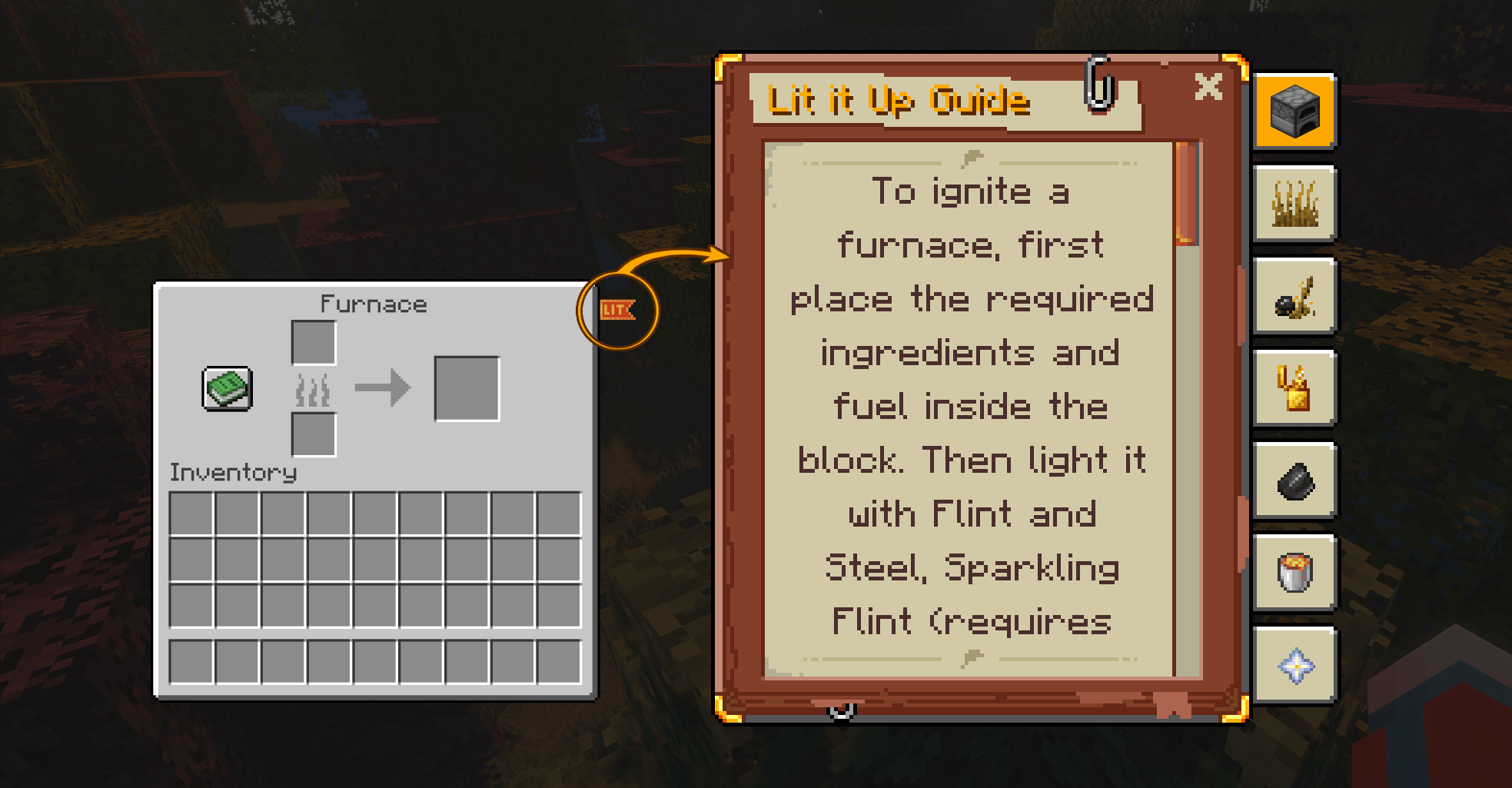 Разместите печь над лавой, огнем или любым другим настроенным горячим блоком или блоком в его зажженном состоянии. Она загорится автоматически, как в ванильной игре, и предмет для розжига не потребуется.