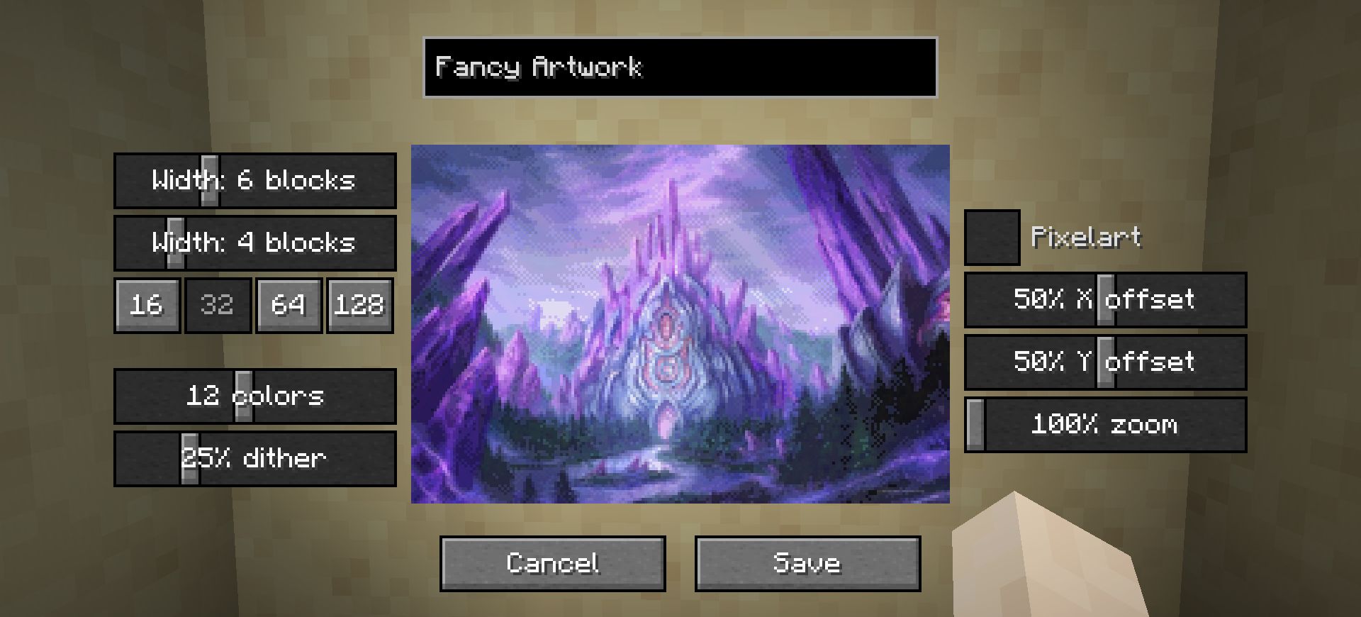 Меню создания позволяет быстро пикселизировать ваши изображения и применять пост-эффекты и дизеринг, чтобы они выглядели так, как будто они вписываются в Minecraft, без лишних хлопот.
