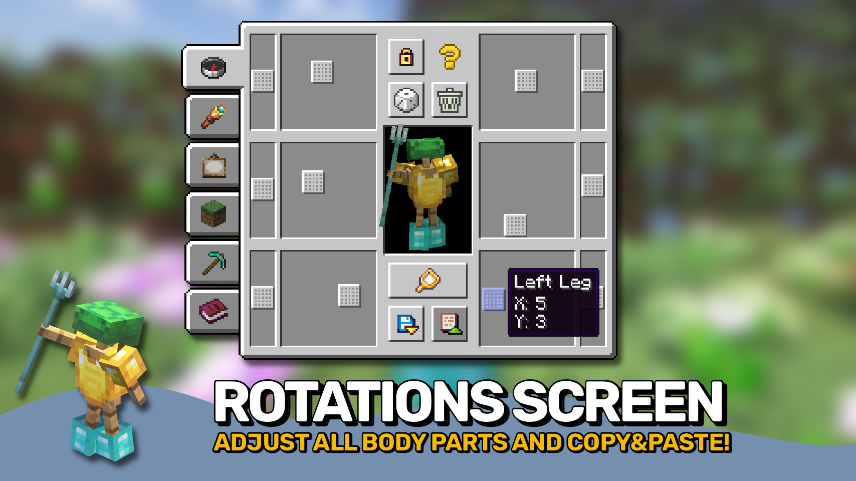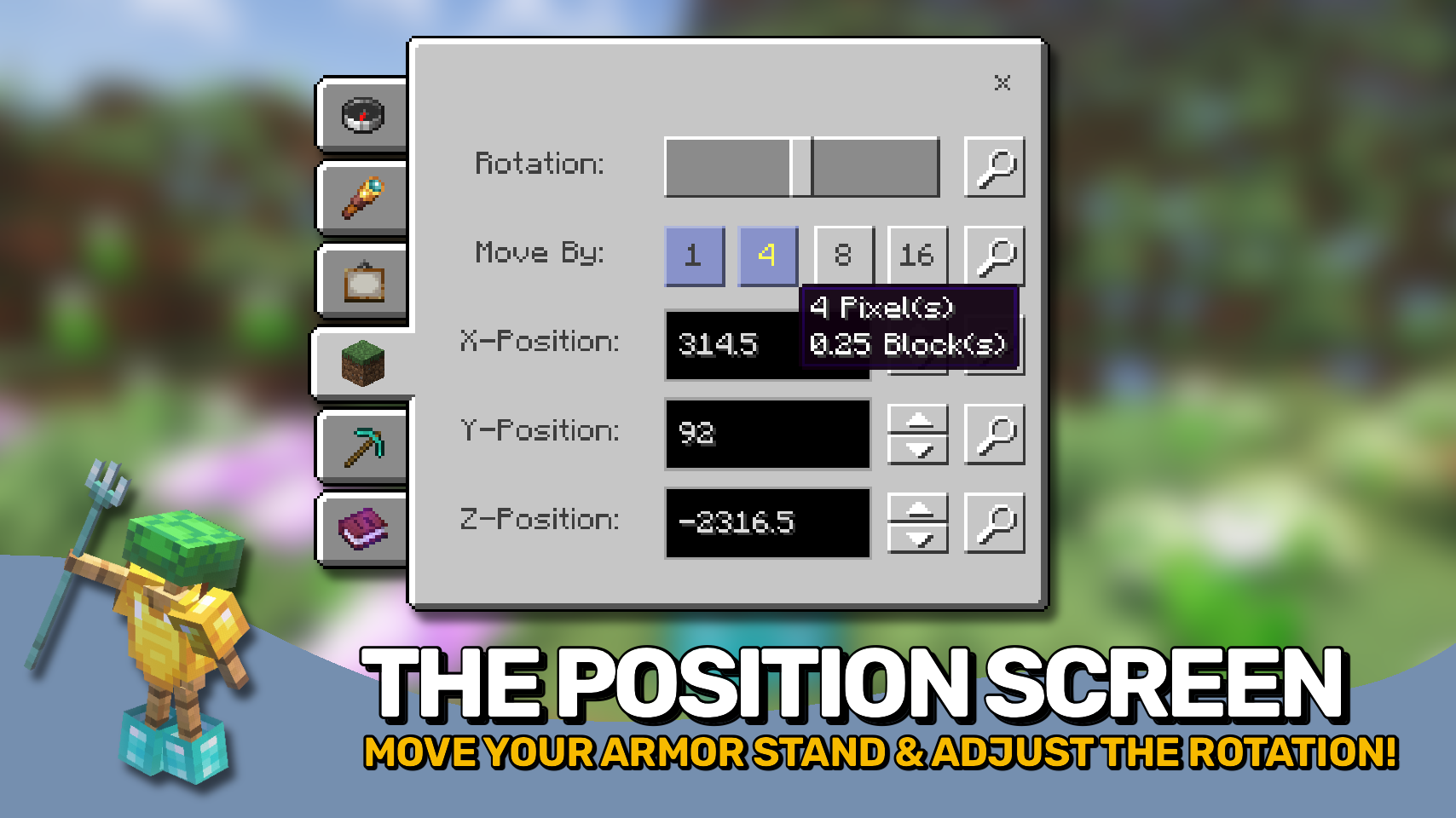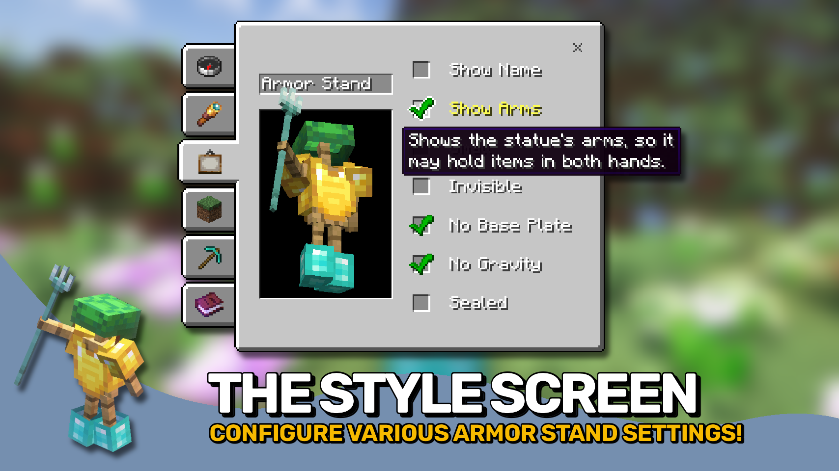 Armor Statues раскрывает весь потенциал стойк для брони: настраивайте всё, от разблокировки рук и вращения каждой части тела до выбора из встроенных поз, регулировки различных стилевых настроек, а также используйте отличные инструменты для позиционирования стойки для брони, даже таким образом, чтобы можно было использовать её только для отображения предметов в вашем мире, делая саму стойку невидимой.