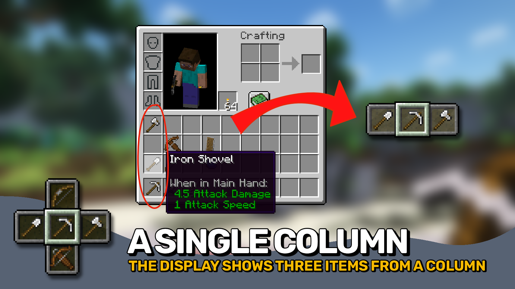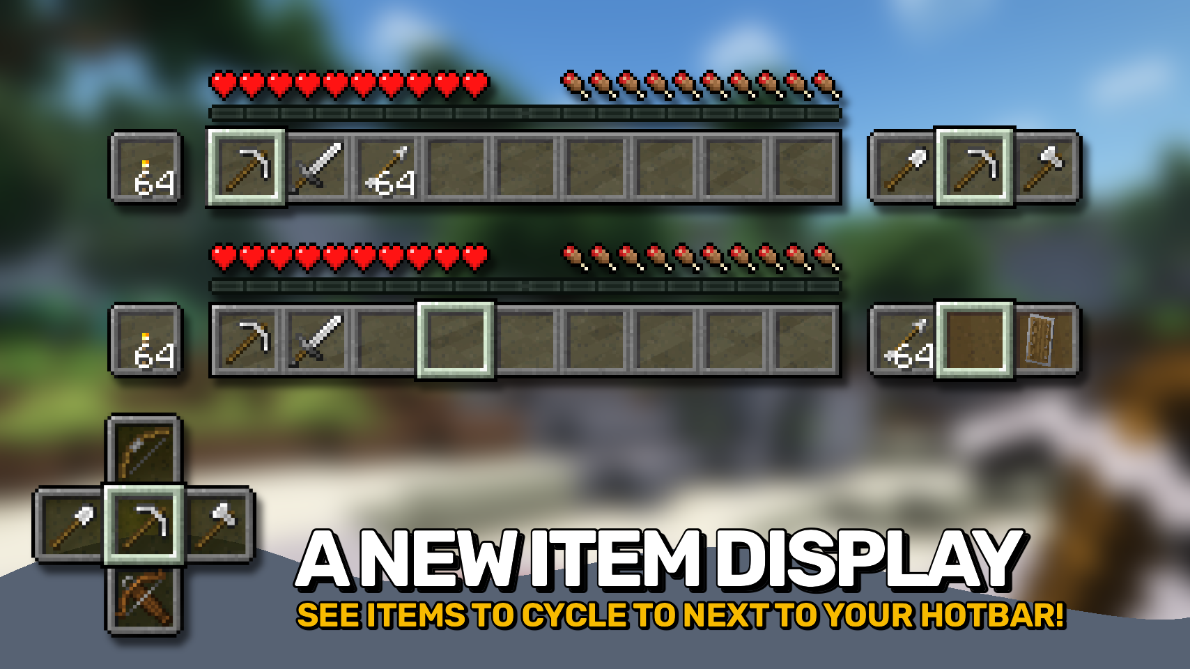 Slot Cycler отлично подходит, когда девяти слотов панели быстрого доступа вам недостаточно: Теперь вы можете быстро менять слот панели быстрого доступа с предметами в том же столбце инвентаря. Очень полезно для быстрой смены инструментов или различного оружия на лету! Чтобы увидеть, какой предмет будет следующим, просто посмотрите справа от панели быстрого доступа, где добавлен новый дисплей.