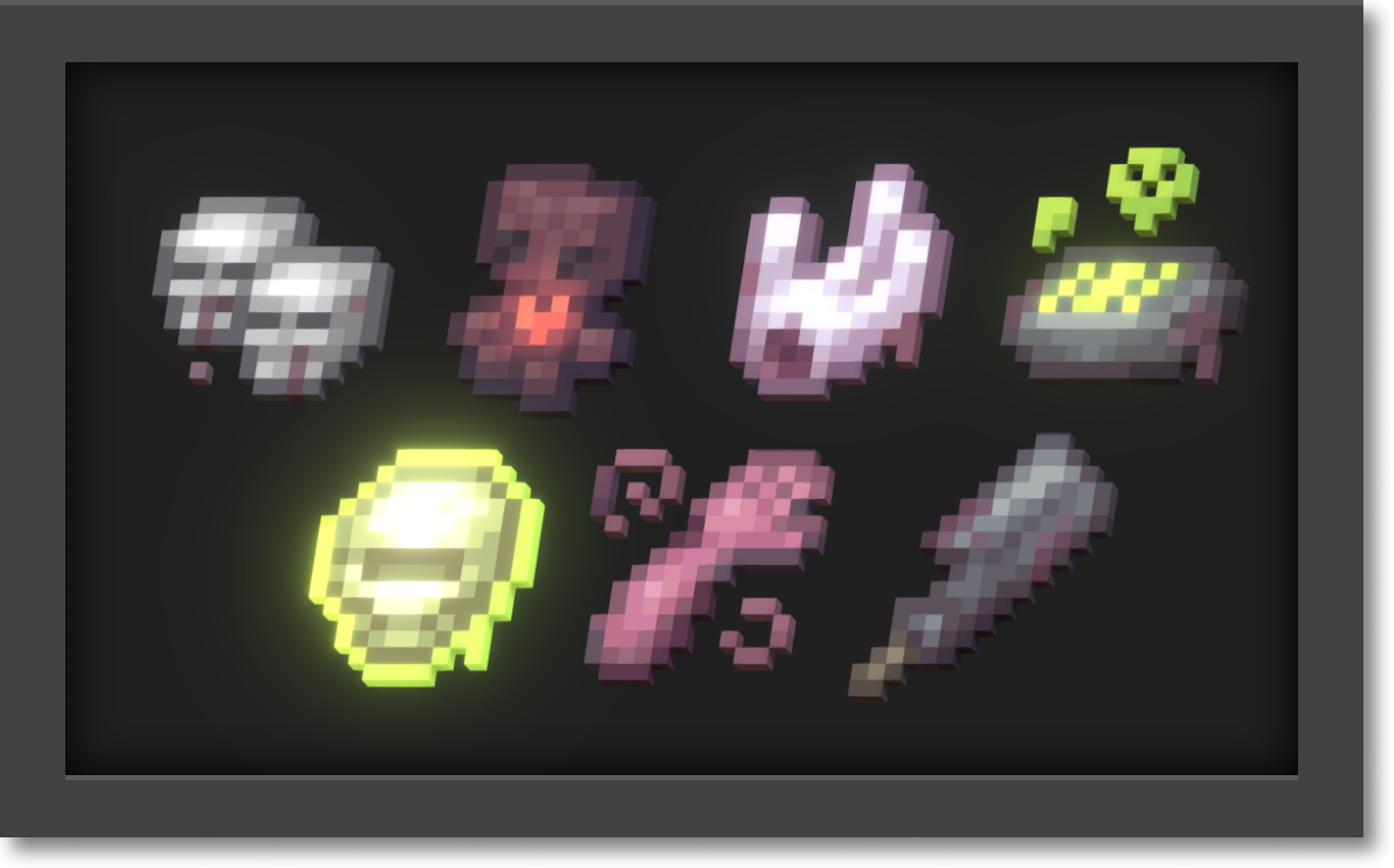С помощью серпа вы можете получить органы убитых врагов (Плоть, мышцы, ребра или сердца). Некоторые мобы имеют разные органы, которые обладают способностями этих мобов. Вы можете съесть органы, чтобы временно усвоить эти способности.