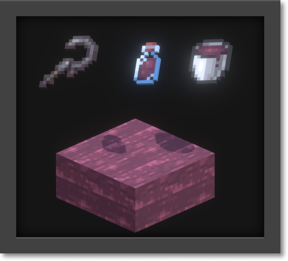 Мод добавляет новый инструмент — Серп Борьбы. Он позволяет быстро нажимать (за счет небольшого количества вашей сытости), а также собирать кровь в стеклянные бутылки. Кровь можно смешать с пеплом в ведре, чтобы создать ведро крови (которое может исцелить вас).