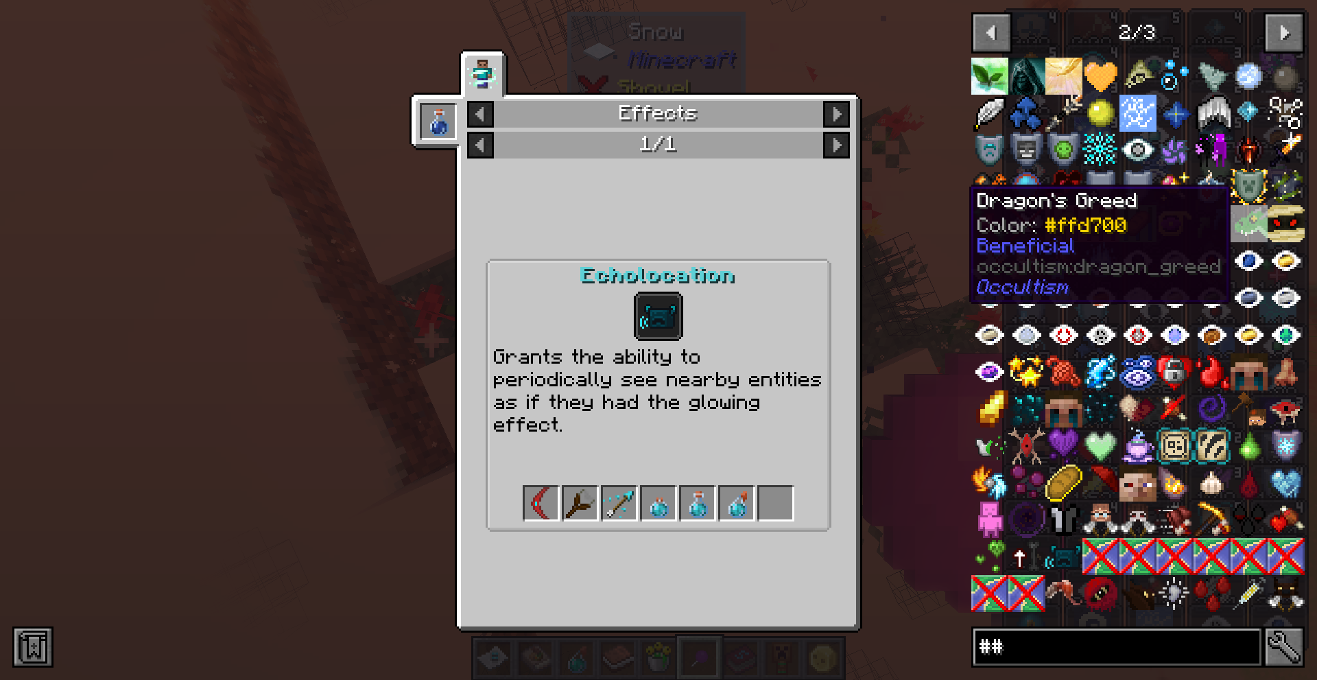 Очевидно, что данный мод не поддерживает все существующие моды! При желании, вы можете легко изменить или добавить описания эффектов, добавив/изменив строку "effect.[mod_id].[effect_name].description" в языковом файле. Будем очень признательны, если вы поделитесь добавленными описаниями в комментариях, чтобы мы могли включить их в мод! Для более подробного руководства по настройке обратитесь к странице JEED на CurseForge.