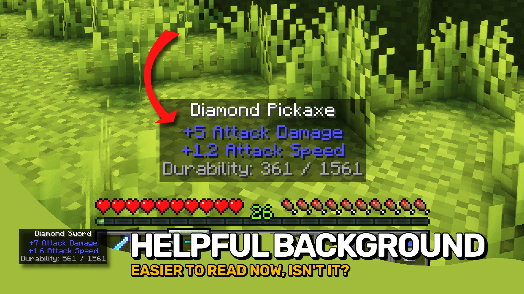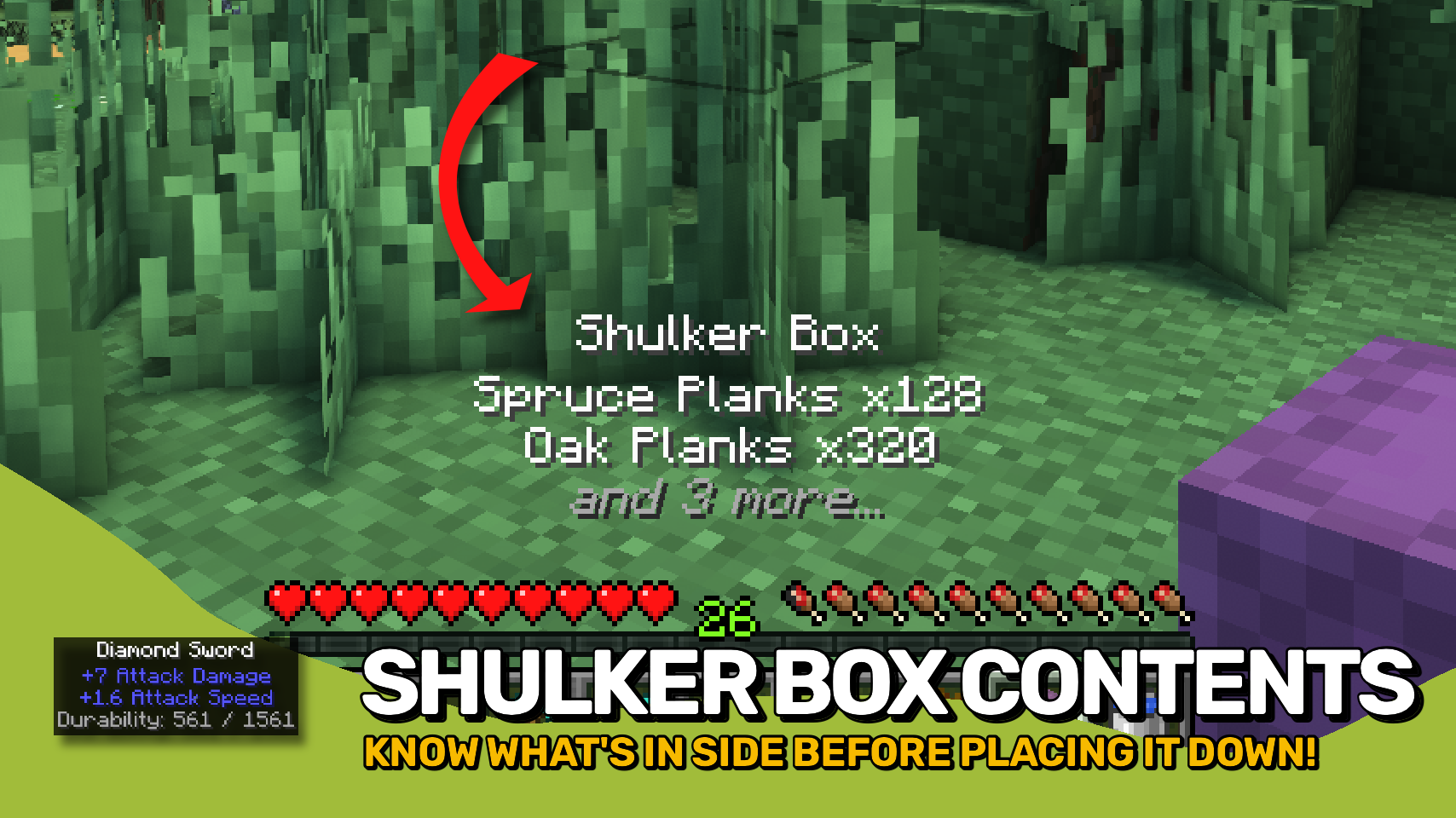 Held Item Tooltips - это простой мод: всплывающие подсказки, отображаемые над панелью быстрого доступа при переключении предметов, теперь включают гораздо больше информации! Например, прочность инструментов, зачарования, содержимое шалкеровых ящиков, эффекты зелий, длительность полёта ракет и многое другое. Полностью настраивается: изменяйте цвета шрифта, порядок, количество строк, активируйте дополнительную информацию и многое другое!