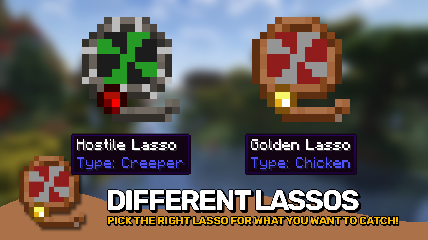Mob Lassos добавляет удобные инструменты для перемещения мобов: теперь вы можете просто скрафтить лассо, чтобы транспортировать большинство мобов в своём инвентаре! Не требуются поводки или корм для животных!