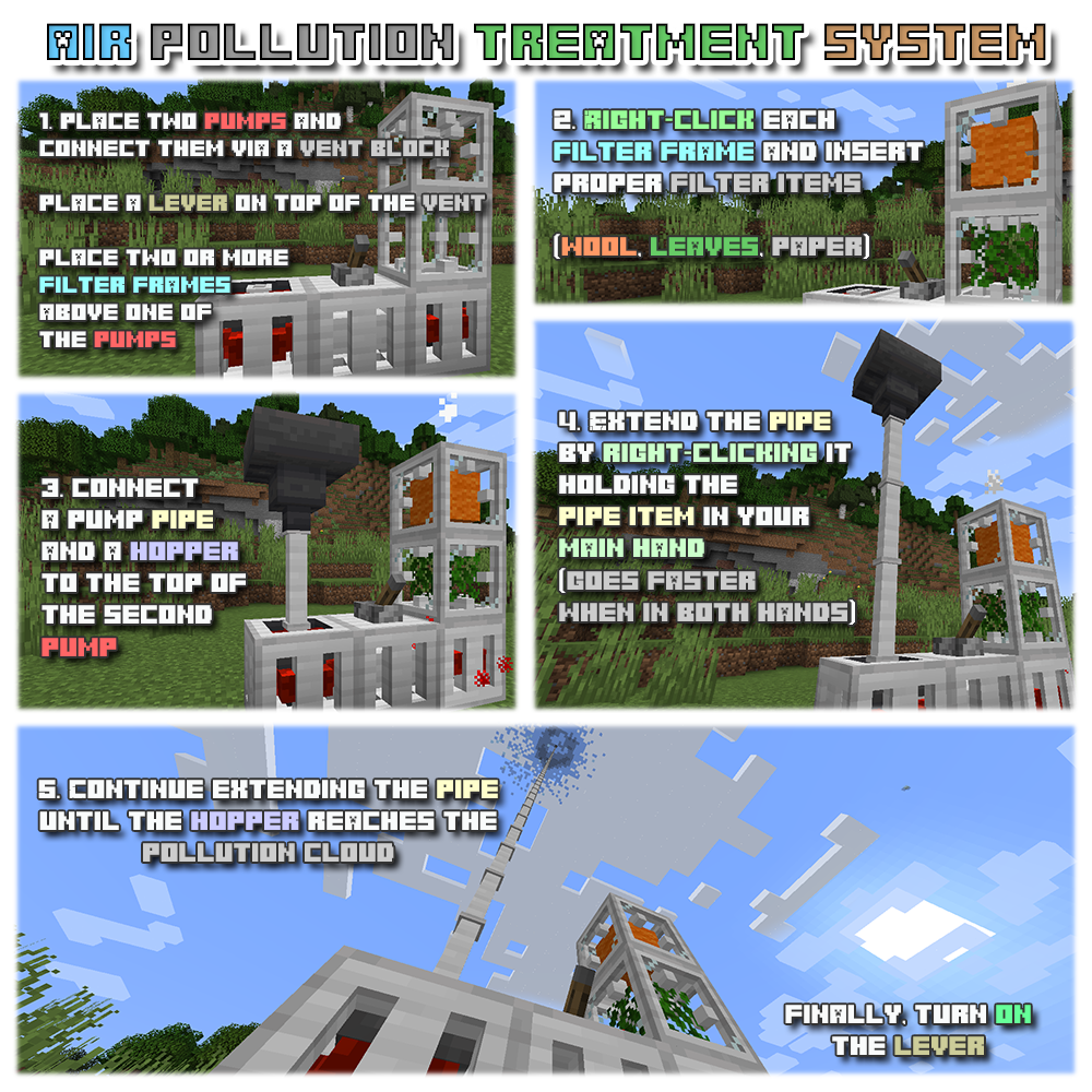 Каждый работающий очиститель генерирует воздух, свободный от загрязнителей, вокруг себя в пределах указанного радиуса (по умолчанию — 8, 16 и 32 блока для железного, золотого и алмазного фильтра соответственно). Эффект уменьшается со 100% (рядом с очистителем) до 0% (на расстоянии >= радиус фильтра). Эффекты нескольких очистителей воздуха суммируются.