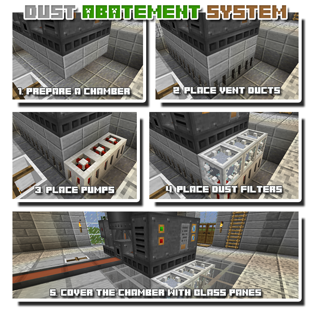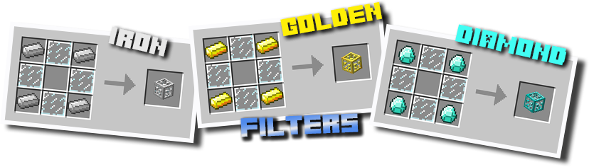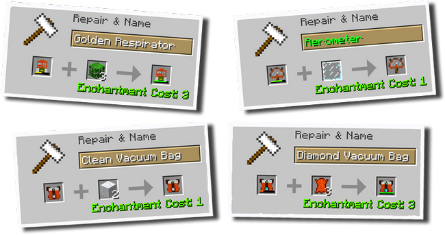 Созданные вакуумные мешки оснащены серным фильтром, который можно обновить на наковальне с помощью шерсти (2 куска). Дополнительные фильтры для углерода или пыли можно установить с помощью листьев или бумаги (2 куска).