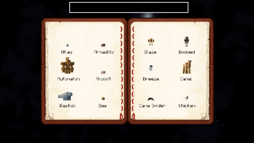 - 📚 Игровой интерфейс журнала – Красиво отрисованная книга с двумя страницами для просмотра мобов.