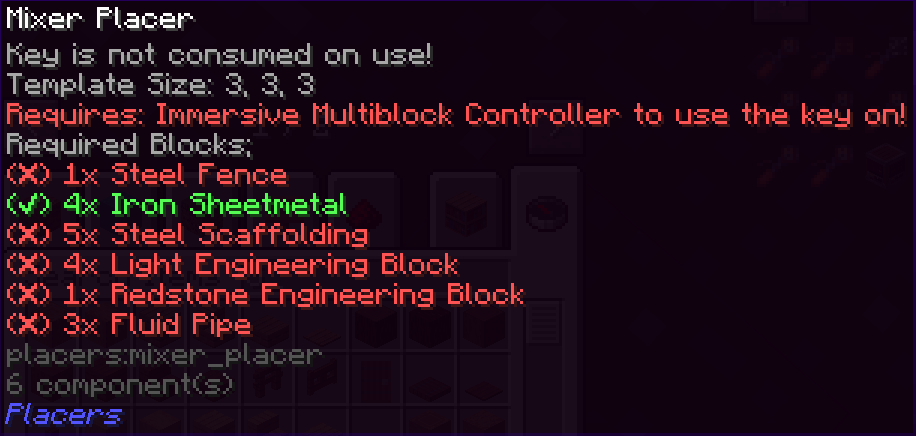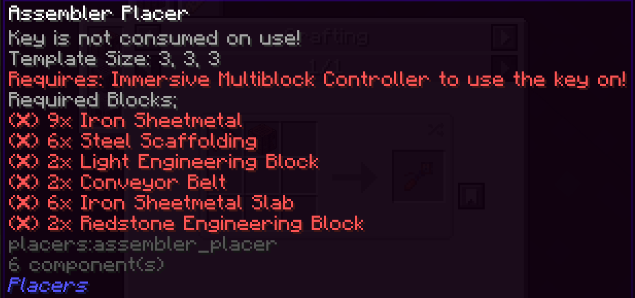 Плейсеры - Immersive Engineering добавляет один блок и некоторые предметы-плейсеры. Предметы-плейсеры перечисляют блоки, необходимые для создания этой структуры. Когда эти предметы-плейсеры используются на Immersive Multiblock Controller, он разместит блоки, необходимые для этой структуры, при условии, что у вас есть требуемые блоки.
