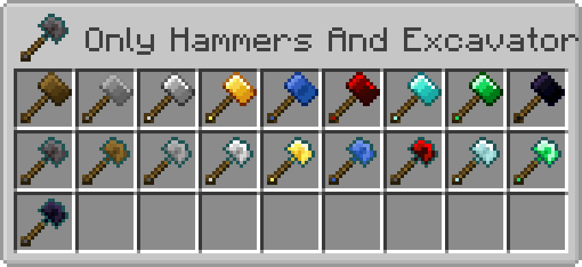 Only Hammers And Excavators добавляет большое разнообразие молотов и экскаваторов, которые могут добывать ресурсы на области 3x3, что делает добычу полезных ископаемых и копание значительно быстрее и эффективнее.