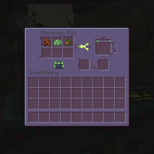 Dungeon's Delight включает новую станцию крафта, известную как Monster Pot. Monster Pot работает очень похоже на Cooking Pot из Farmer's Delight, но должен нагреваться блоками, подобными спавнерам, и может создавать новые продукты, известные как Monster Foods, которые предоставляют специальные новые эффекты!