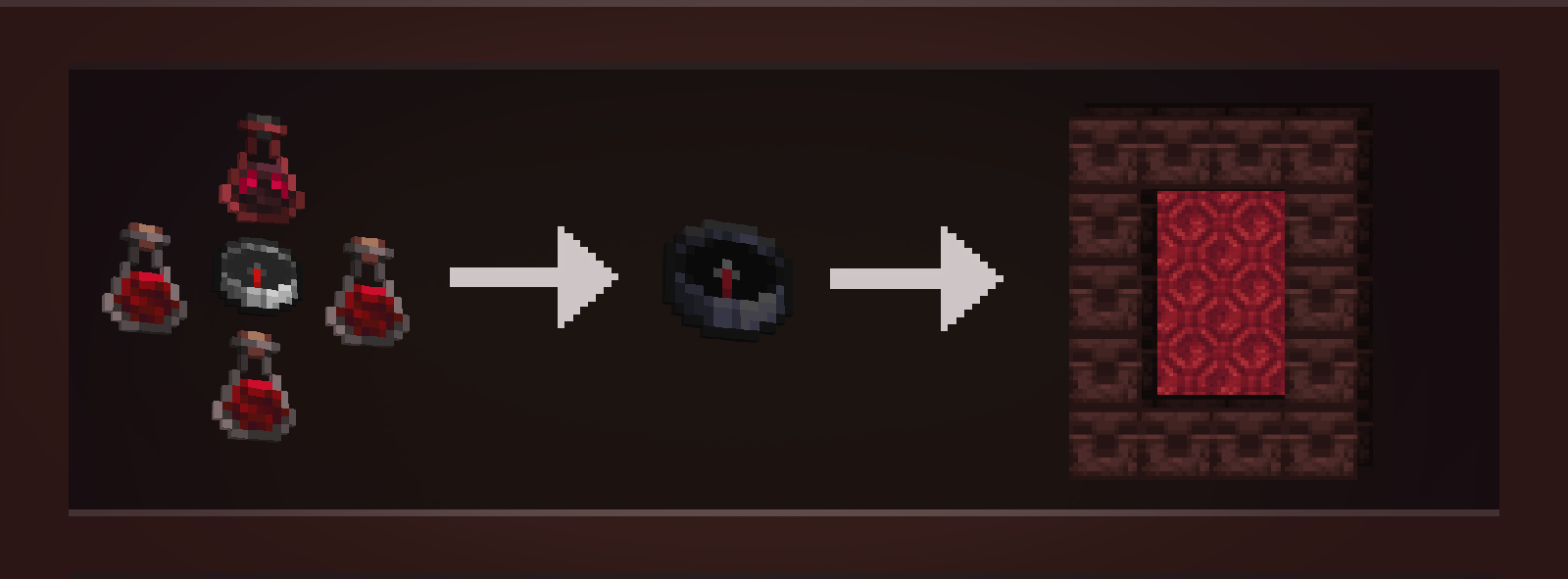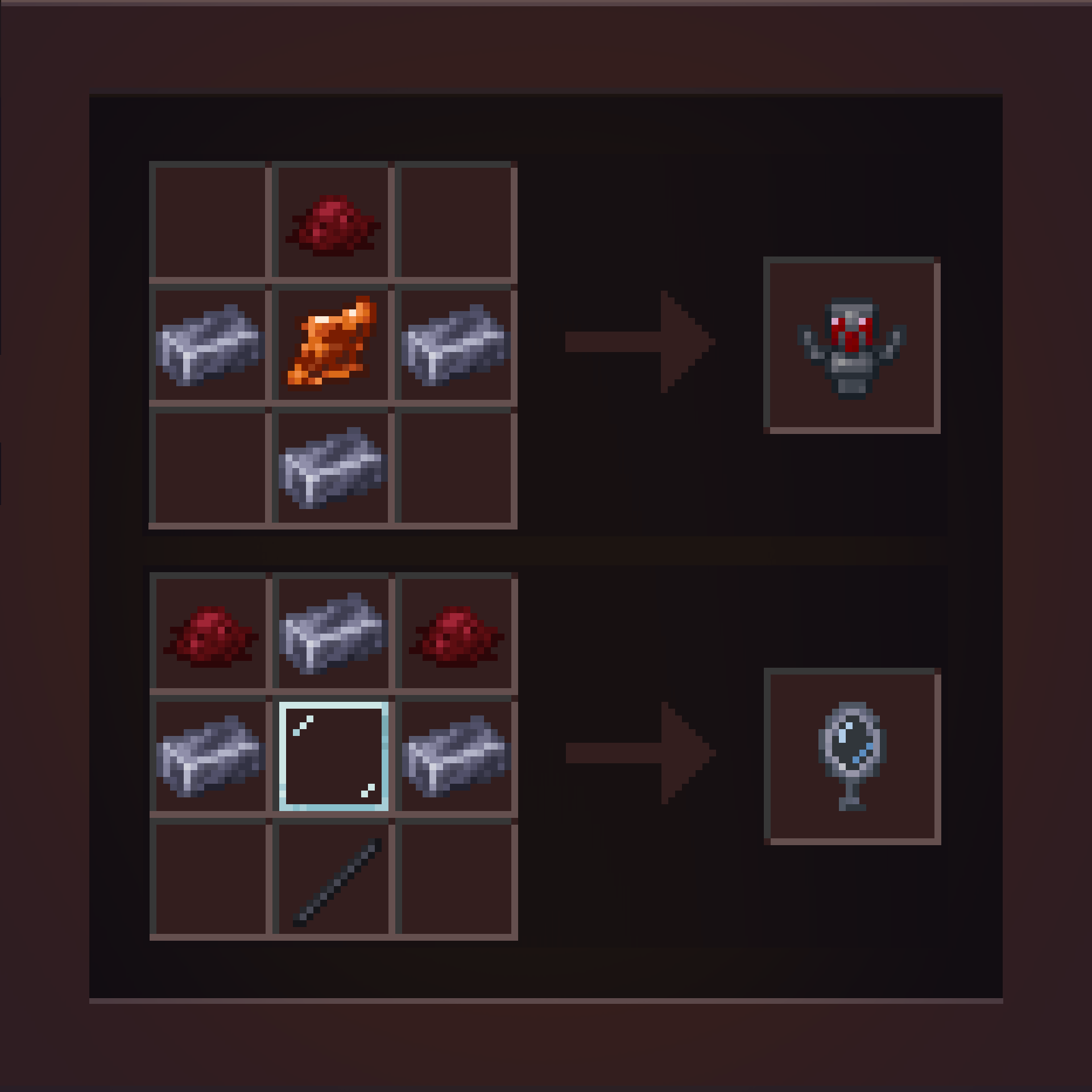 Для проведения ритуалов вам понадобятся иды подношений, сделанные из тёмной стали, красного янтаря и высушенной крови или проклятых костей, тёмной стали и высушенной крови. (используйте мод JEI, чтобы узнать все рецепты)