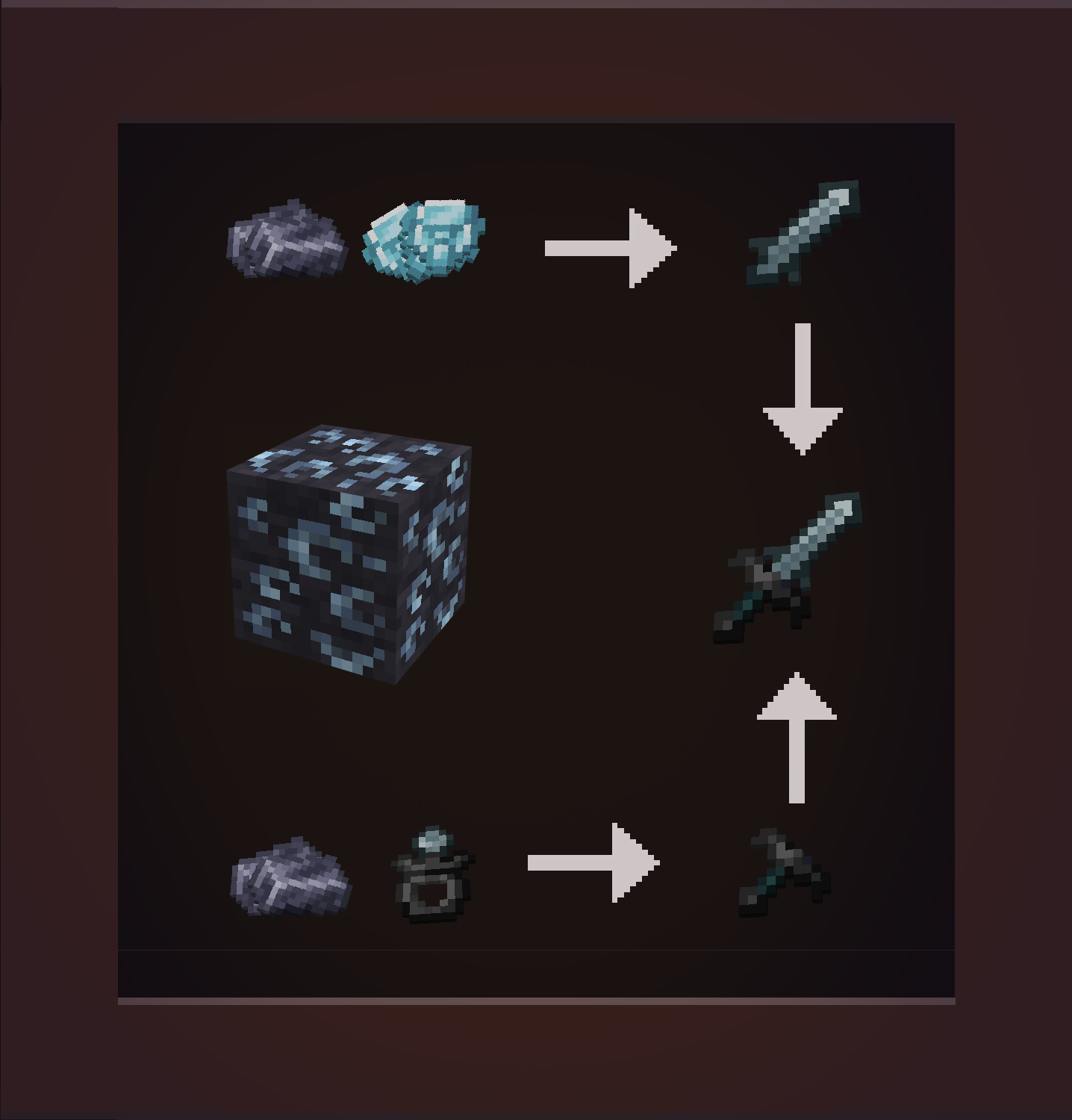 С помощью этого вы можете скрафтить довольно мощный набор инструментов. Он менее прочен, чем незерит, но прочнее алмаза, эффективнее незерита, может быть починен Бутылками с кровью на наковальне и даёт кратковременный эффект Спешки при нажатии ПКМ.