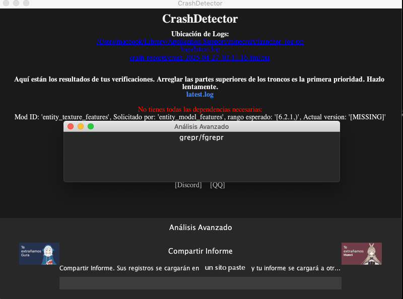 Если вы разработчик мода, вы можете реализовать наш интерфейс com.asbestosstar.crashdetector.Extencion, чтобы включать новые ошибки, связанные с вашим модом, указывать новые логи для поиска, добавлять новые кнопки в графический интерфейс, добавлять разделители и очистители логов, добавлять новые API и сайты для пастбинов, пользовательские исправления и многое другое. Вам не нужно знать много испанского, и большинство терминов похожи на английские. Создатели модпаков также могут использовать эту функциональность для своего модпака, но если вам нужны более глубокие изменения, рекомендуется форкнуть CrashDetector. CrashDetector не защищен интеллектуальной собственностью, поэтому вы можете свободно форкать его и вносить любые изменения, даже не упоминая, что ваш форк как-то связан.