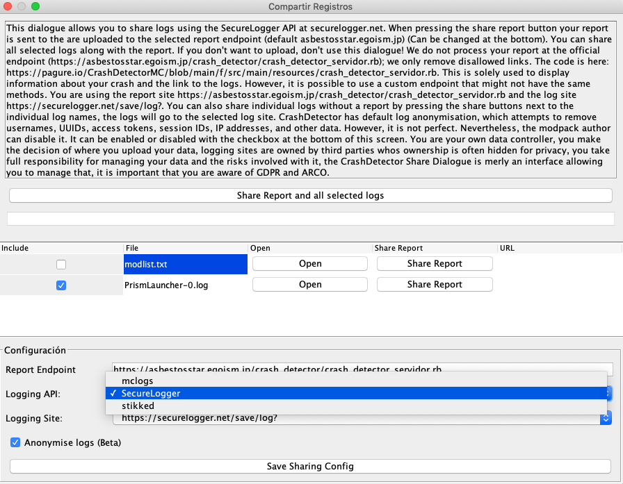 По умолчанию Crash Detector настроен на анонимизацию ваших логов на стороне клиента; это можно включить или отключить в конфигурации в нижней части экрана общего доступа. Это удалит конфиденциальную информацию, такую как токены доступа, UUID, имена пользователей и IP-адреса, перед их загрузкой на сайт логов. Это все еще бета, поэтому могут существовать проблемы. Вы также можете переключить сайты логов и конечные точки отчетов здесь. Вы также можете использовать пользовательский сайт логов, если он поддерживается выбранным вами API, путем редактирования конфигурации в папке crash_detector.