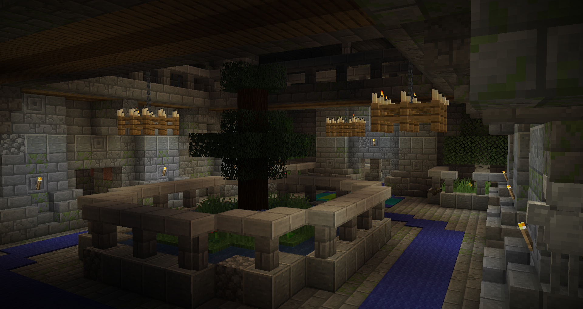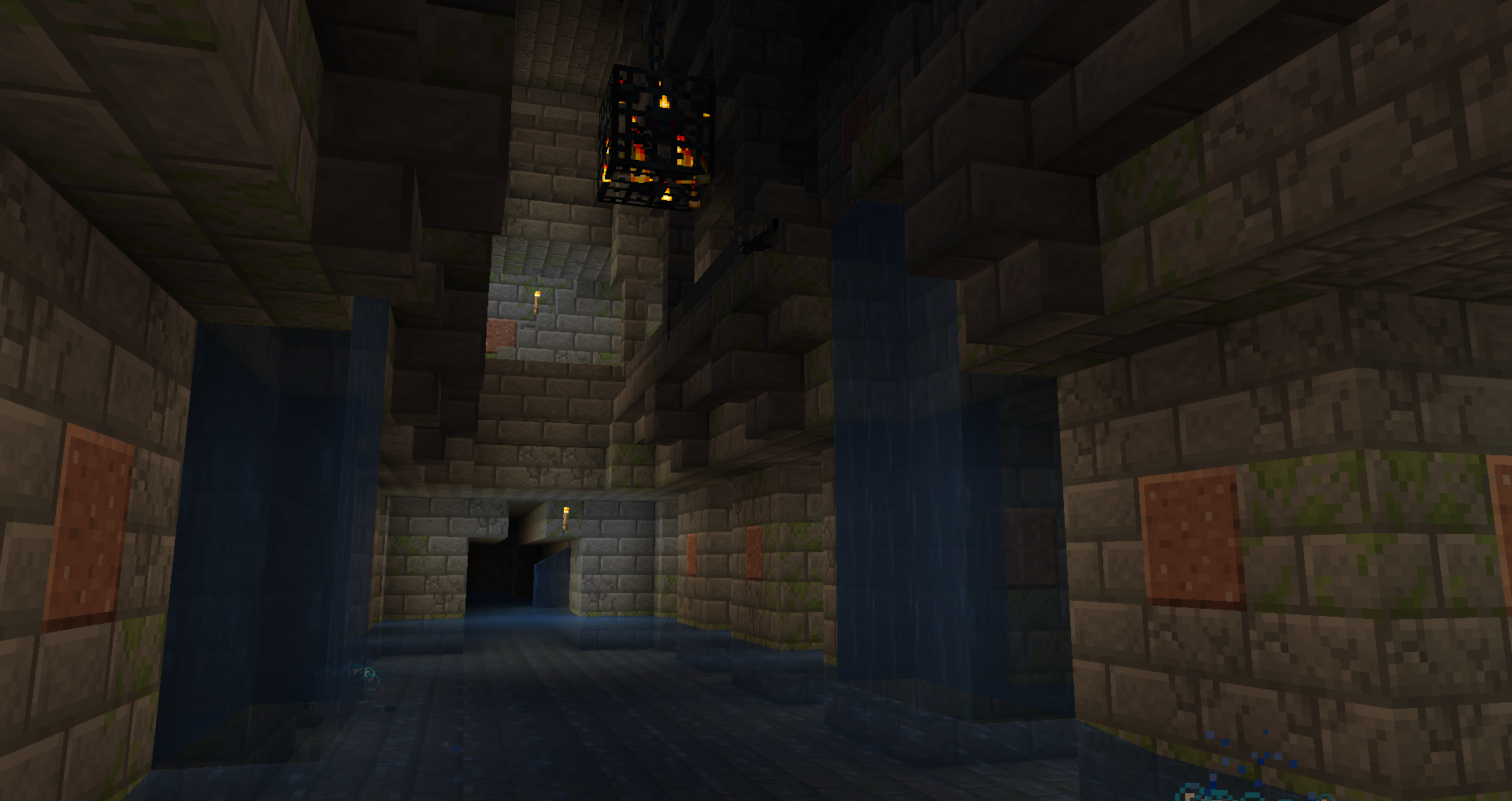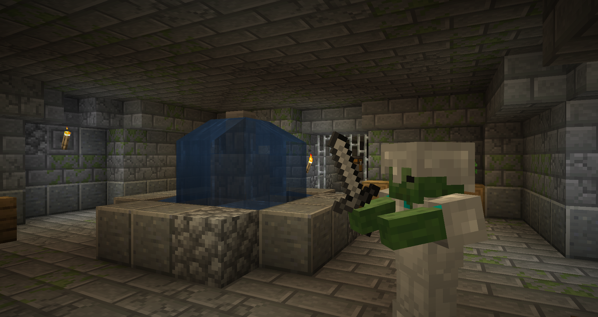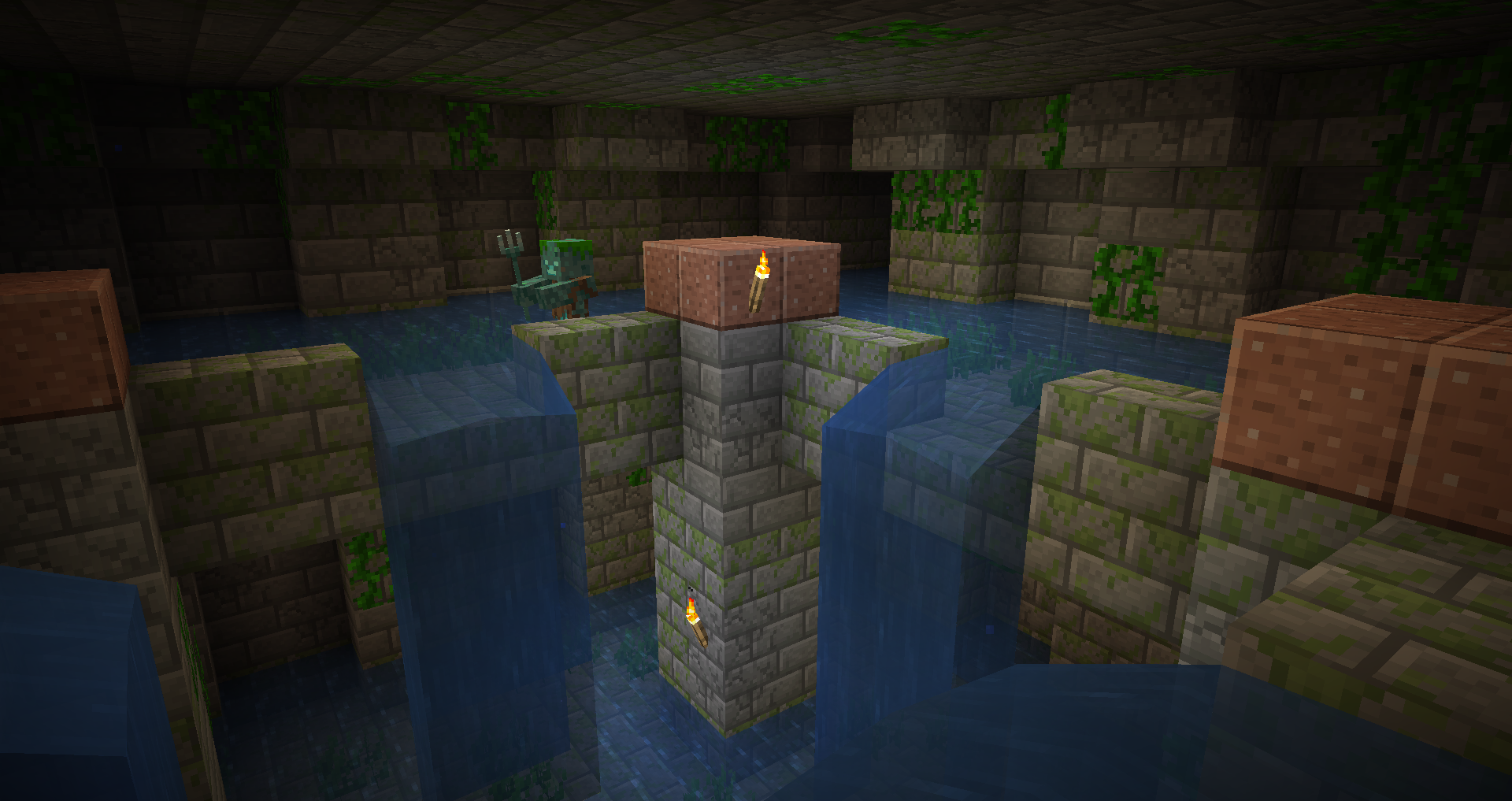Комнаты из замшелых каменных кирпичей, заросшие и затопленные водой. Здесь вас ждут криперы, слизни и утопленники. Некоторые утопленники вооружены трезубцами, так что будьте осторожны!