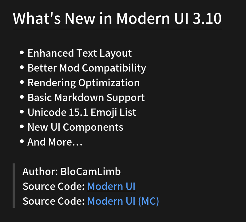 Modern UI для Minecraft — это модификация (Mod) для Minecraft, основанная на Modern UI Core Framework и Modern UI Core Extensions. Она предоставляет программу загрузки Modern UI в среде Minecraft и Modding API на основе Forge/Fabric для создания мощных графических интерфейсов в Minecraft.