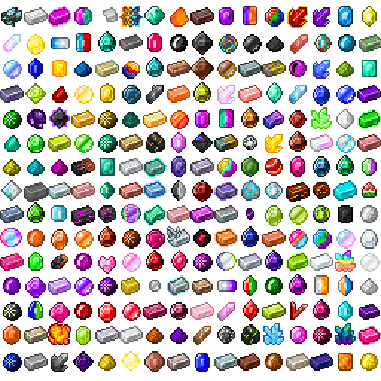 Самоцветы 💎 (и другие минералы): Амазонит, александрит, янтарь, аметист, аметрин, аквамарин, турмалин, цитрин, хризолит, флюорит, гранат, индиголит, иолит, нефрит, яшма, кунцит, малахит, опал, перидот, призма, рубин, сапфир, сардоникс, шпинель, сугилит, танзанит, топаз, оникс, хлороний, розовый кварц, бирюза, арбузный турмалин, рутил, аммолит, азурит, дымчатый кварц, павлинья руда, павлиний топаз, танзанит (редкая версия), везувиан, (редкий) сапфир, (редкий) цитрин, (редкий) аметист, кварц "Медуза", малиновый алмаз, (тёмно-синий) сапфир, яшма "Закат", (австралийский) сапфир, гакманит, гошенит, питамбари нилам, киноварь, чёрный опал, лабрадорит, грандидьерит, 12 видов циркона, циановый изумруд, оливин, стибнит, герцинит, соноранит, халькантит, говлит (снежные биомы), питерсит (пустыня и мезас), радужный опал (болотные биомы), матричный опал (только в пышных пещерах, уровни Y 0-8), ирис-агат, жёлтый оникс (только в пышных пещерах), брикерит.