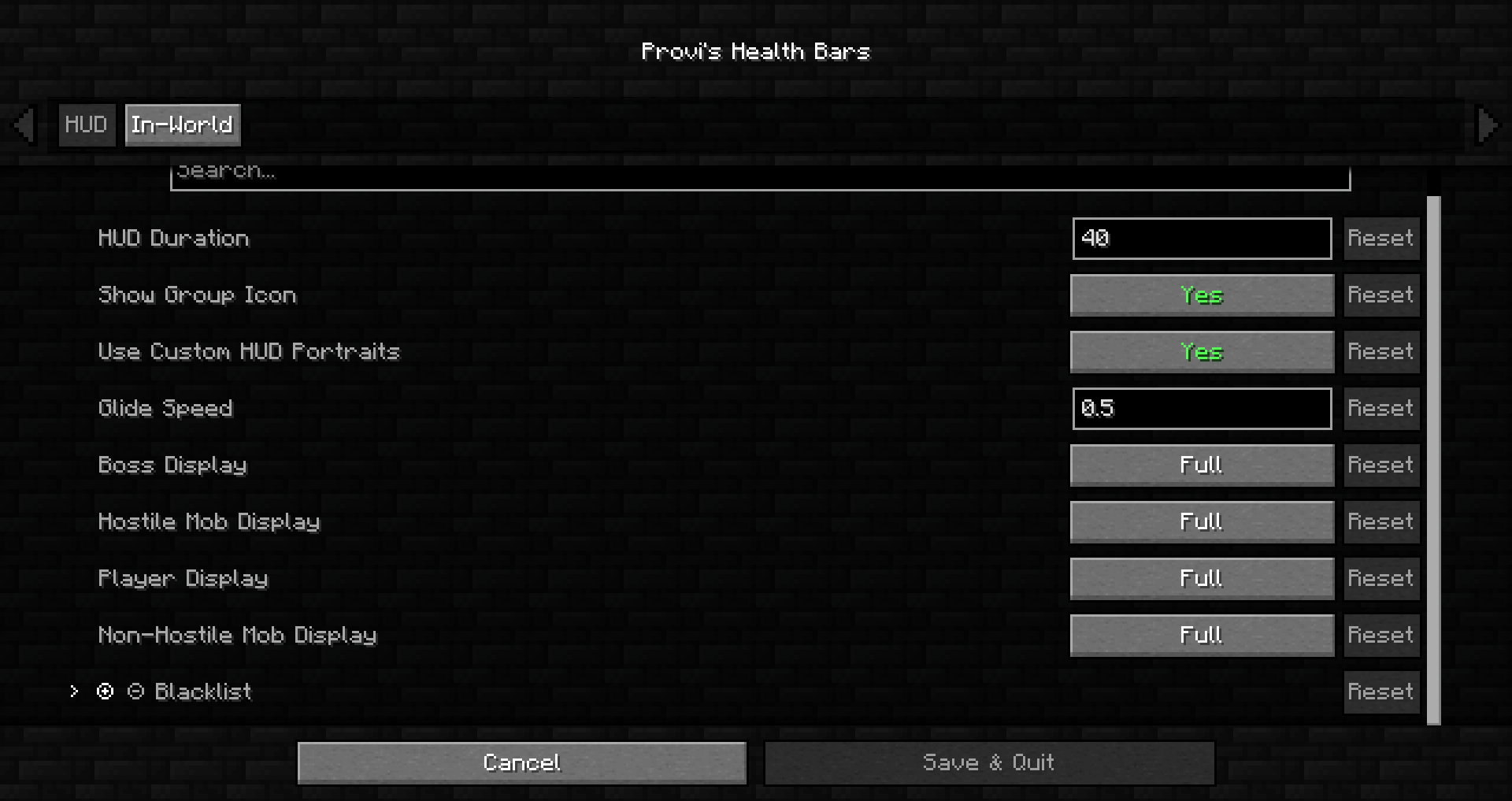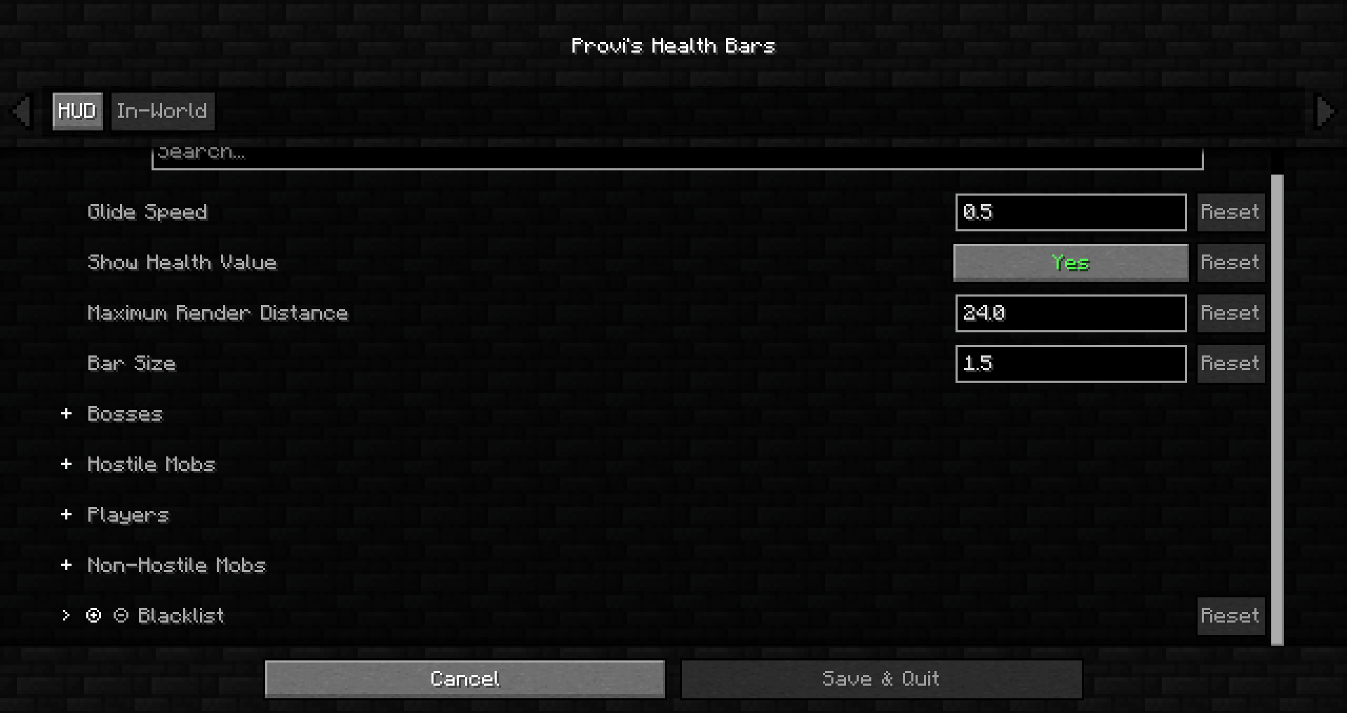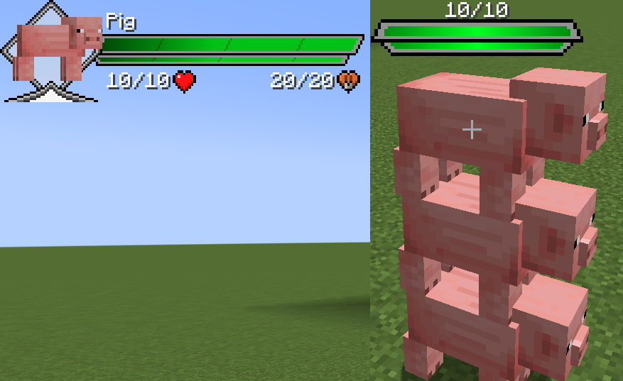 Provi's Health Bars добавляет как полосу здоровья HUD для вашей текущей цели, так и полосы здоровья в мире для всех мобов. Поведение обоих может быть настроено подробно в меню настроек.