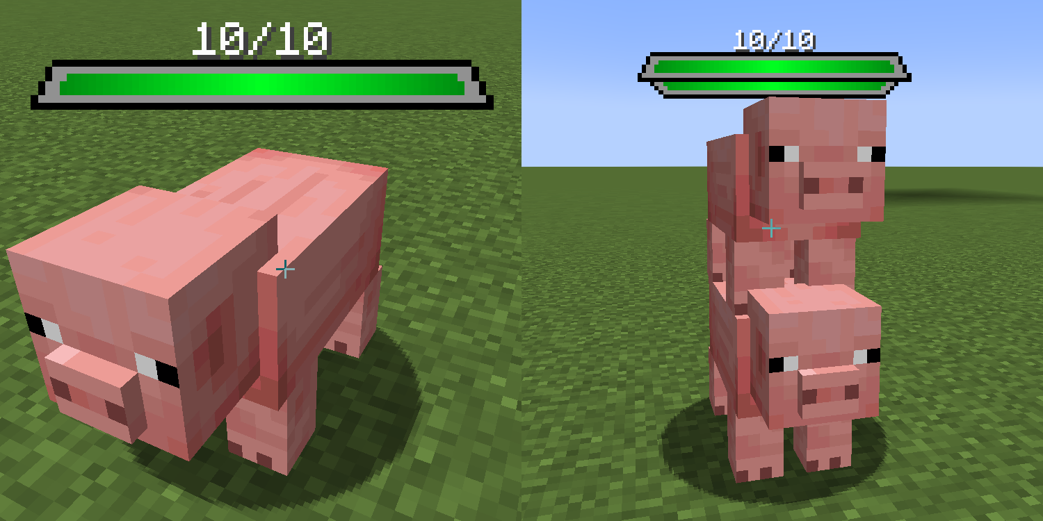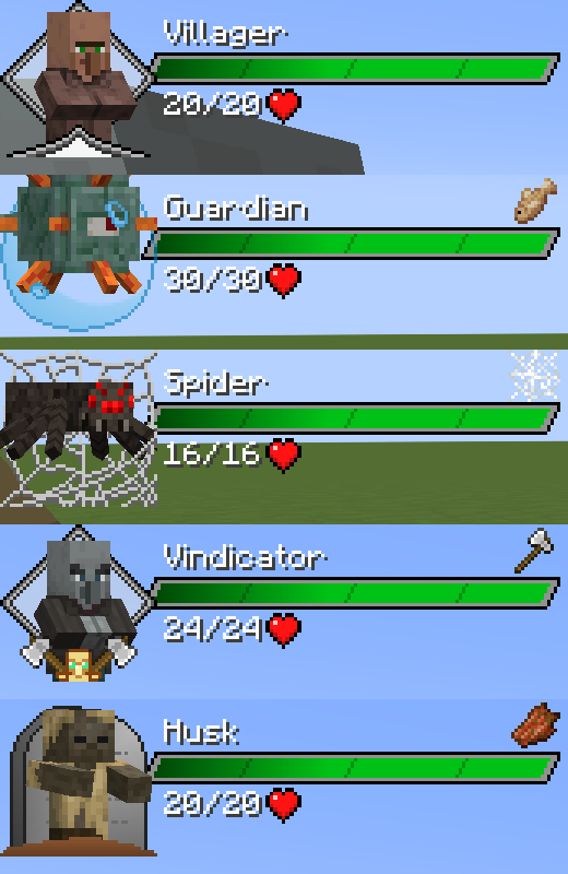 Полоса здоровья HUD изменяет внешний вид в зависимости от Entity Group моба, на которого вы нацелились. Другие моды могут использовать API entrypoint этого мода для добавления дополнительных портретов HUD и иконок для пользовательских Entity Groups или даже конкретных мобов.