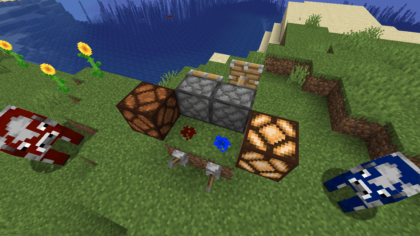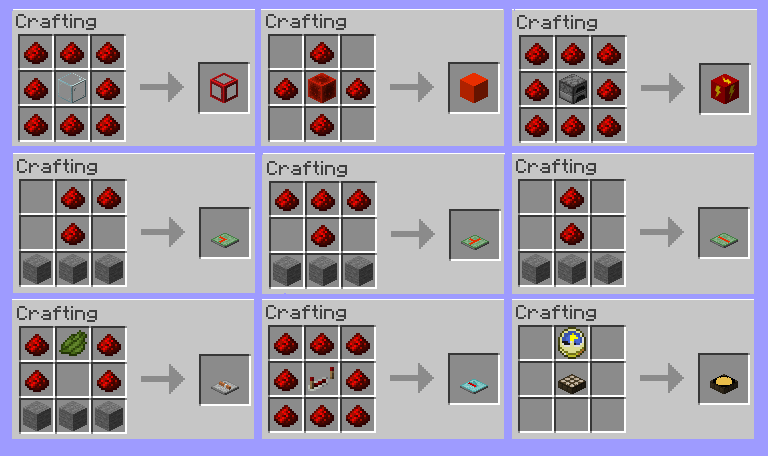 * И провод из синего камня (Bluestone Wire). Он не соединяется с проводом или трубой редстоуна. Его можно прокладывать поверх трубы редстоуна. В настоящее время он еще не создает коротких боковых соединений. Используйте T-образный изгибатель или дополнительный кусок провода. Основано на первоапрельской шутке Mumbo Jumbo.