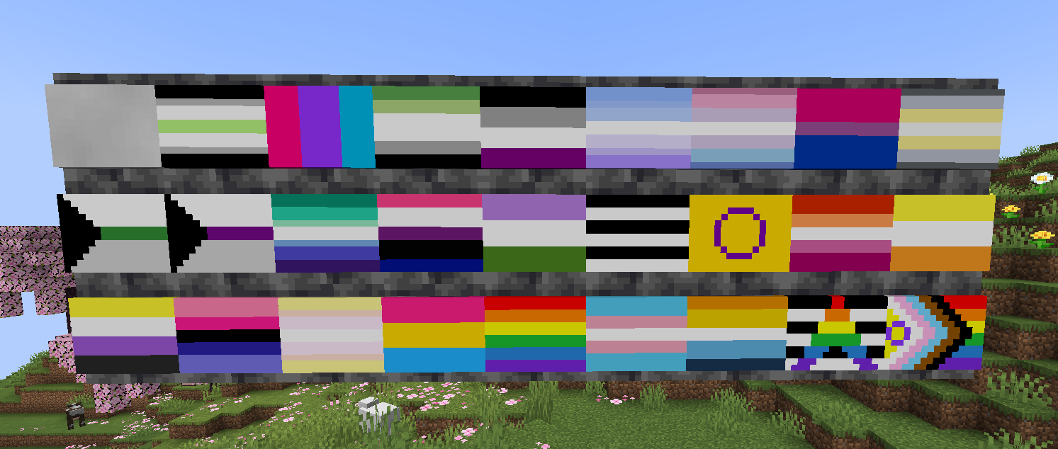 Это модификация, целью которой является добавление декоративных настенных флагов, стилизованных под флаги ЛГБТ+! Данный мод посвящён самовыражению и декорированию. Он не добавляет никаких новых механик, биомов или мобов — всё, что он делает, это добавляет декоративные флаги ЛГБТ+ и больше ничего.
