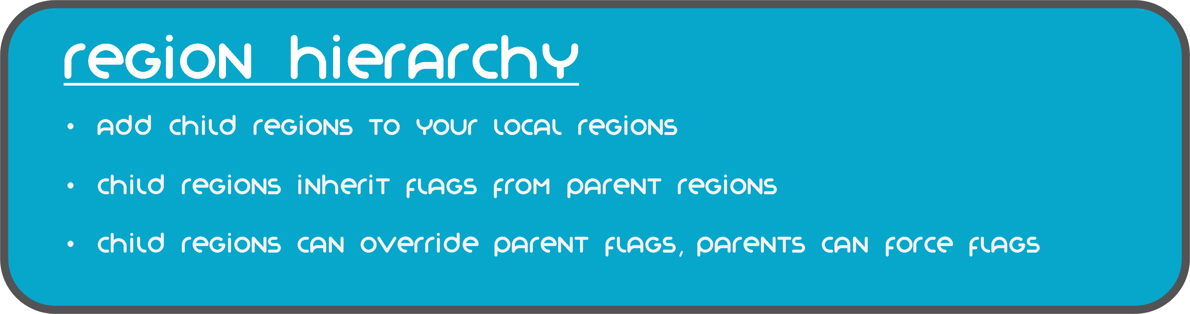 Дочерние регионы наследуют флаги от своих родительских регионов. Кроме того, можно переопределить состояние флага для дочерних регионов, соответствующим образом установив свойство override флага родительского региона.