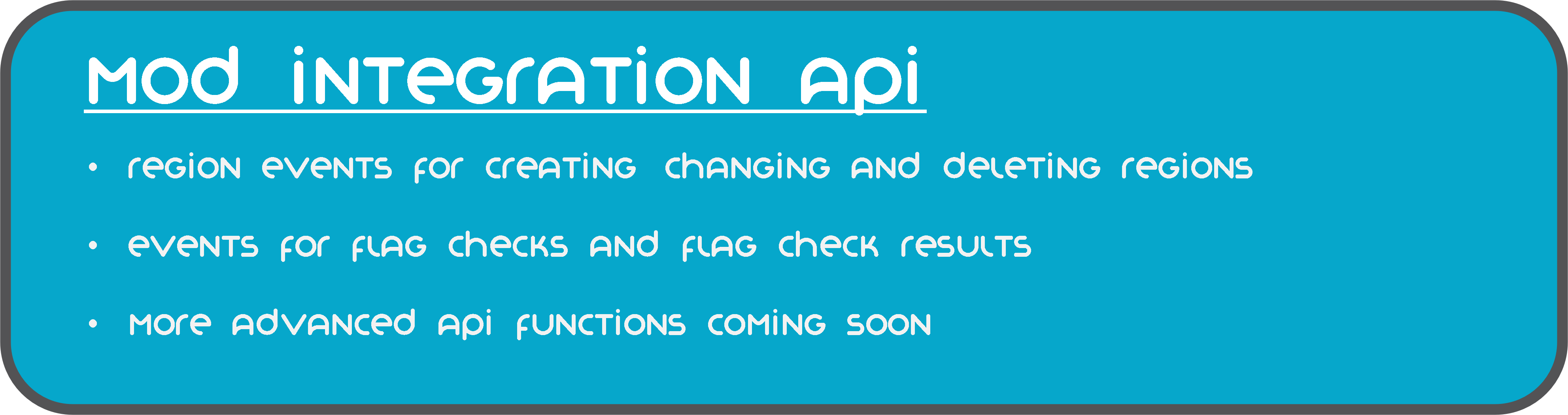 YAWP предоставляет растущий API интеграции модов для более легкой интеграции модов и модпаков. В настоящее время API позволяет другим модам прослушивать события создания, изменения и удаления регионов и отменять эти события, чтобы предотвратить их возникновение.