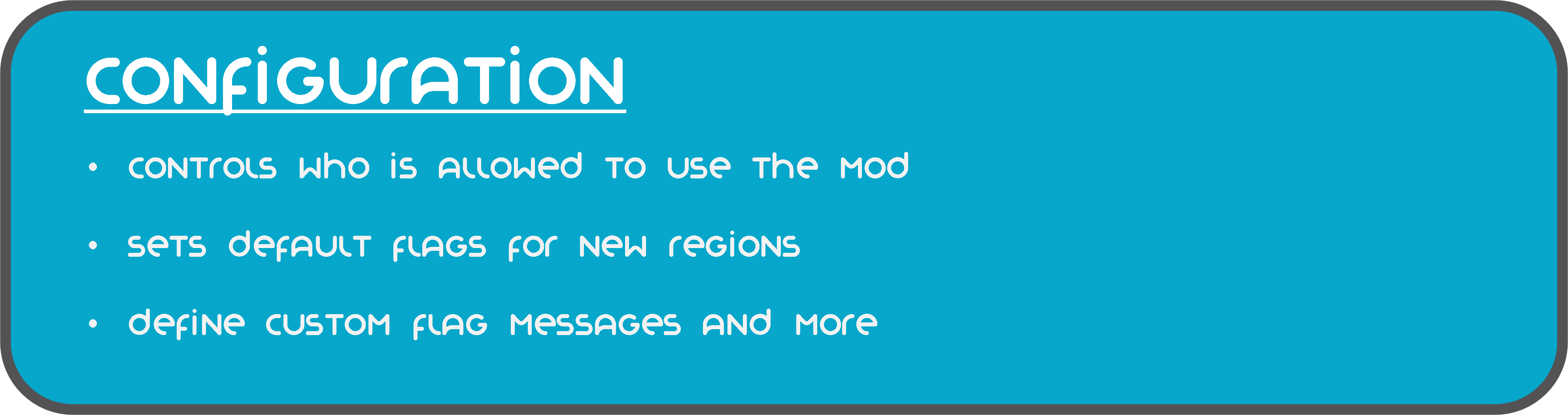 Конфигурация мода позволяет контролировать, кому разрешено использовать мод, устанавливает флаги по умолчанию для Локальных и Измерительных Регионов, параметры интерфейса командной строки и т.д.