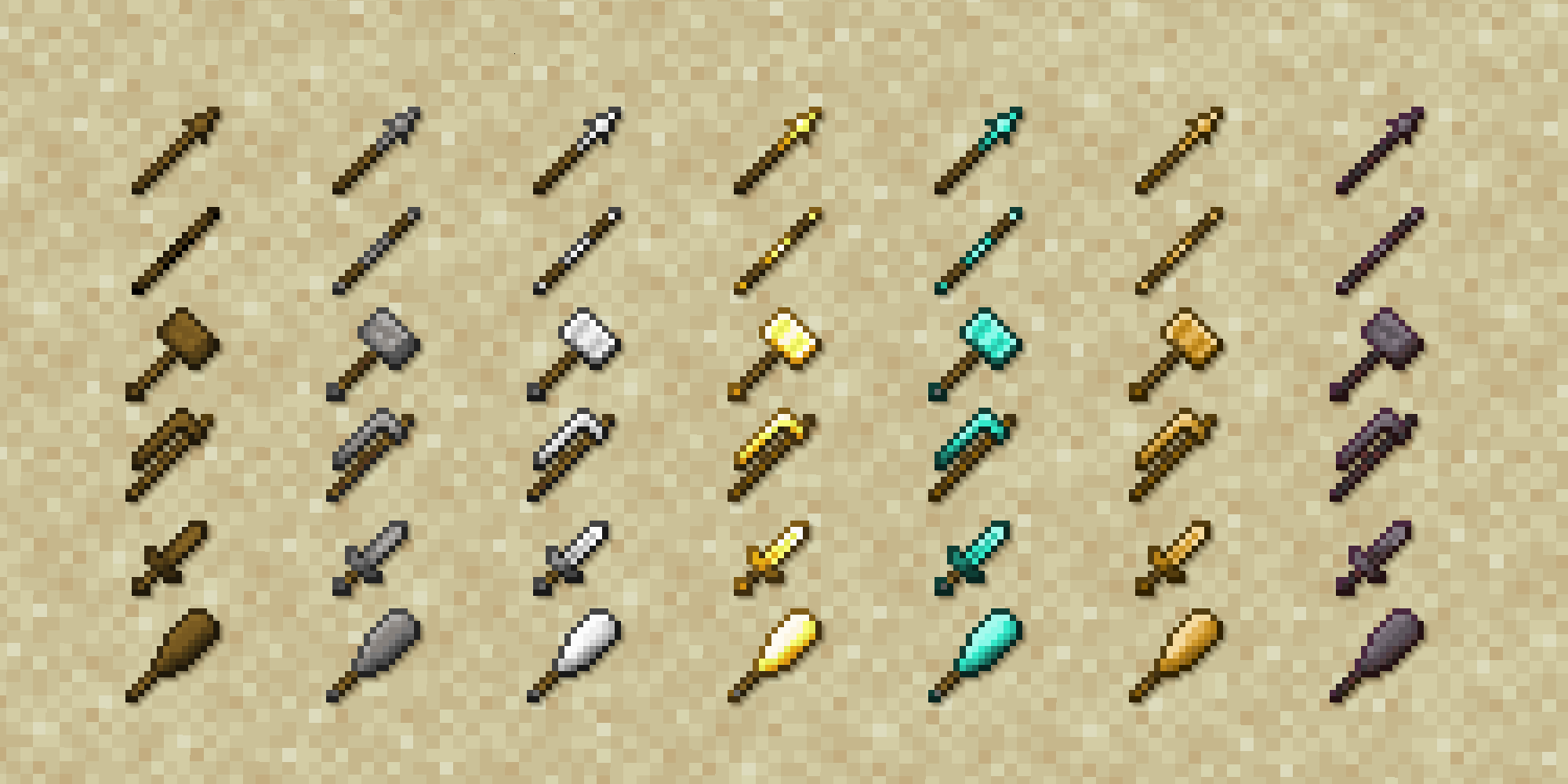 Basic Weapons добавляет 6 новых типов ближнего оружия для каждого ванильного материала инструментов, чтобы дополнить существующие меч и топор в Minecraft. Каждое оружие сбалансировано по урону, скорости атаки, стоимости крафта, дальности атаки и особым эффектам.