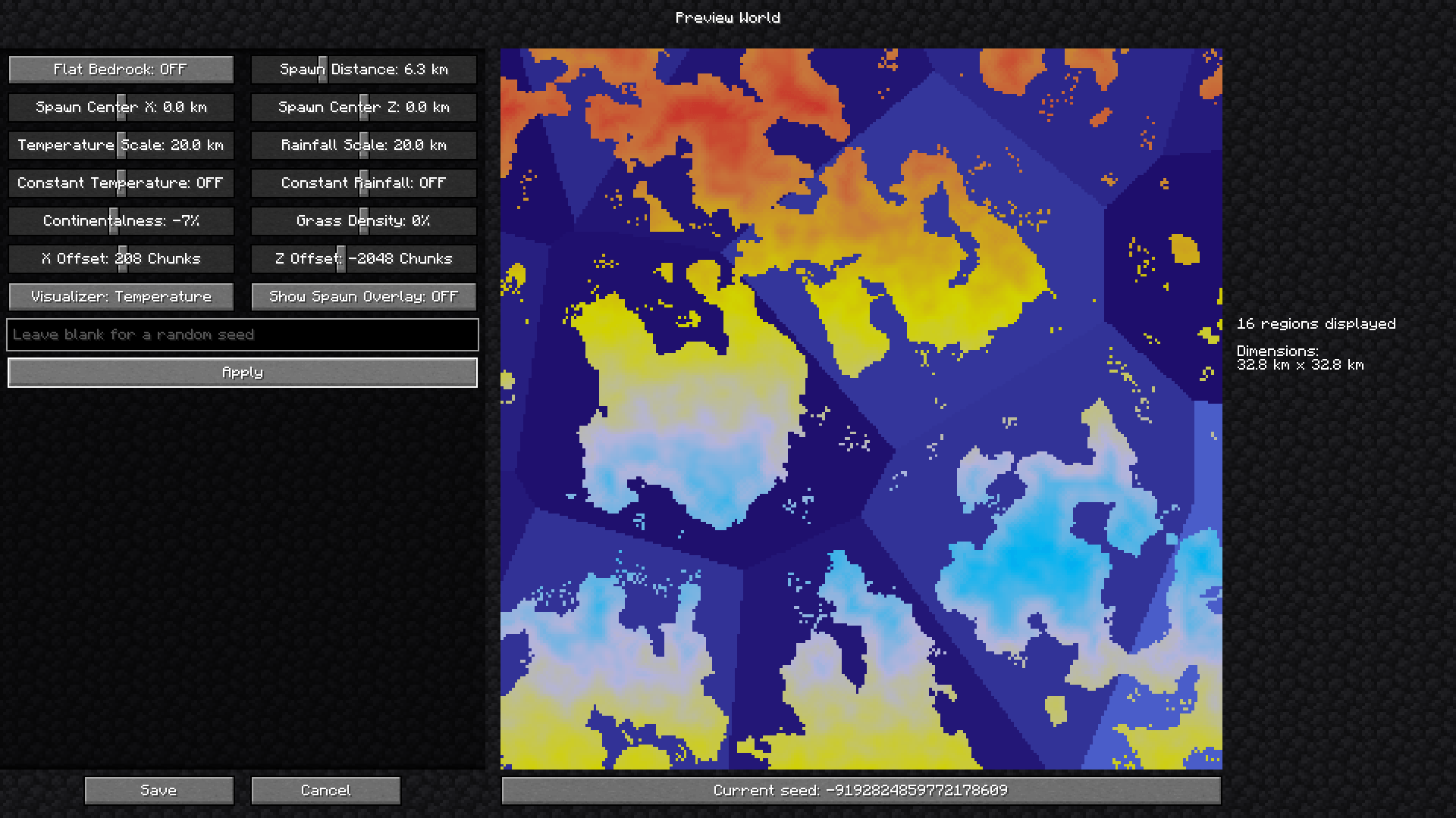 - Сохранить: Сохраняет конфигурацию в контекст создания мира, сохраняя такие параметры, как континентальность и (если не пуст) сид, и возвращает на вкладку "More".