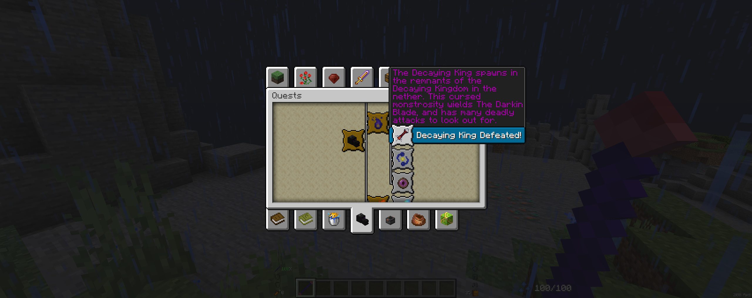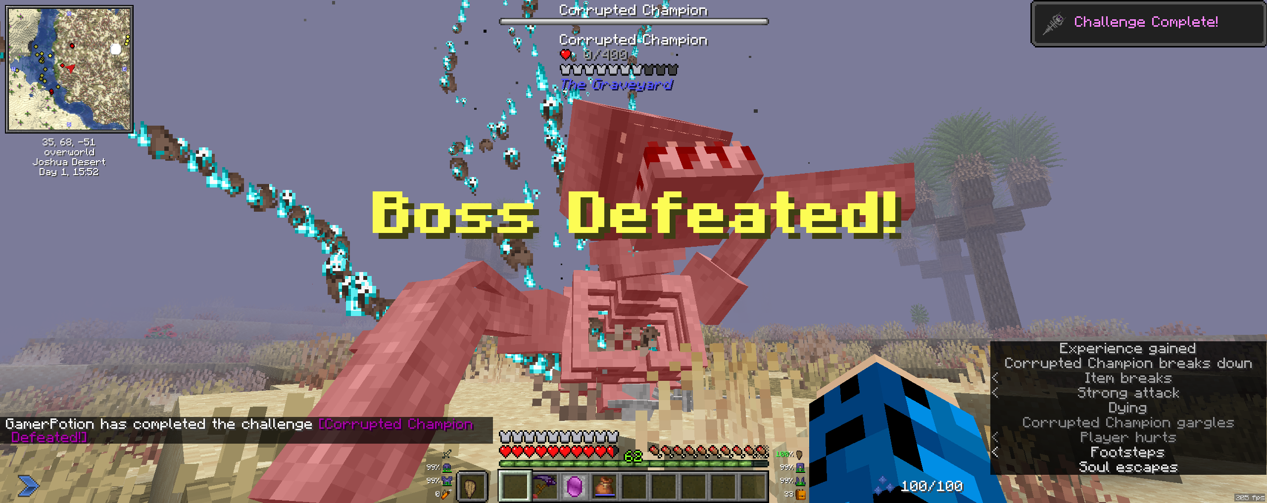 Этот мод добавляет дополнительный раздел достижений (нажмите L и щелкните на голову дракона), который показывает, как призвать босса и где его найти. Всего предоставляется информация о до 15 боссах, включая ванильных. Каждая победа над боссом дарует вам 500 опыта и также показывает специальное сообщение 'Boss Defeated', похожее на игры серии Dark Souls.