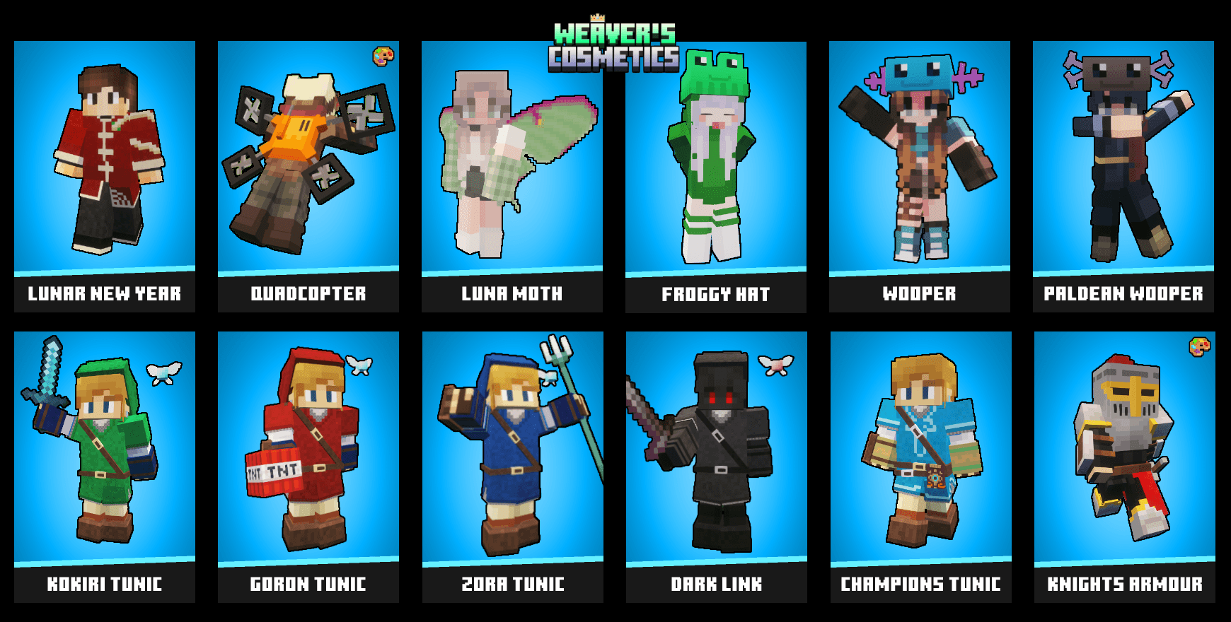 Примечание: С выходом версии для Neoforge 1.21.1 предметы «кроссоверного контента» (например, Pokémon и Zelda) были выделены в отдельный мод Weaver's Cosplay, который уже доступен! Пока я не обновлю изображения ниже, они будут немного неточными, так как этот контент был доступен в финальном релизе этого мода для версии 1.19.2, прежде чем был выделен при переходе на Neoforge 1.21.1. Оба мода по-прежнему предназначены для совместной работы, но сервера Cobblemon/Pixelmon и другие сервера теперь имеют больше контроля над тем, какой контент они хотят использовать.