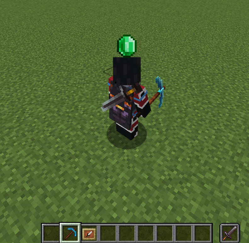 Заменяет резную тыкву на голове на изумруд. Прямо как у Сима. Меч на спине с использованием Arsenal (1.20.1) и предиката