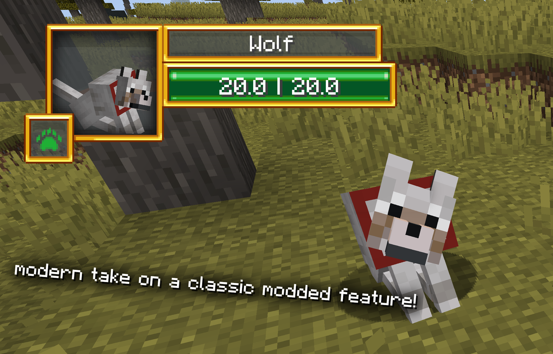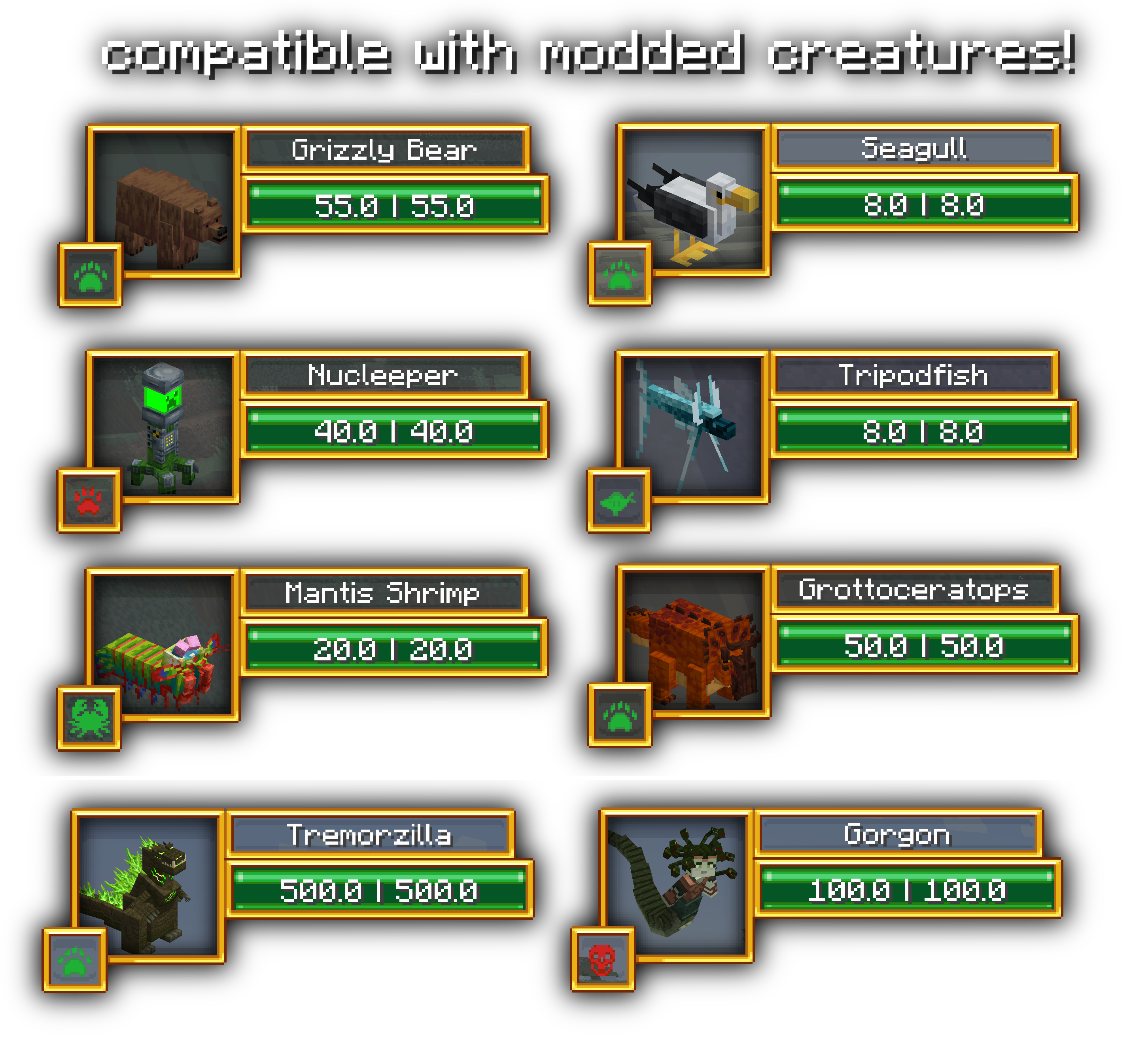 Рядом с портретом моба и полосами здоровья и имени отображается тип моба. Это включает членистоногих, животных, illagers, нежить, боссов и других. Он также совместим с существами из других модов: