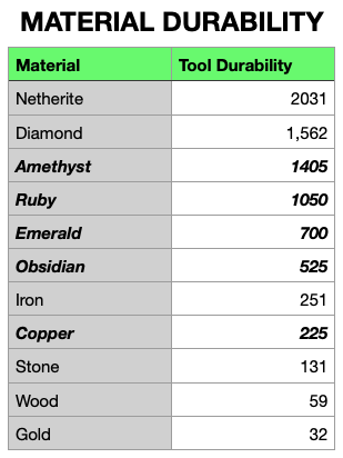 - Инструменты площади для ванильного дерева, железа, золота, алмаза и незерита