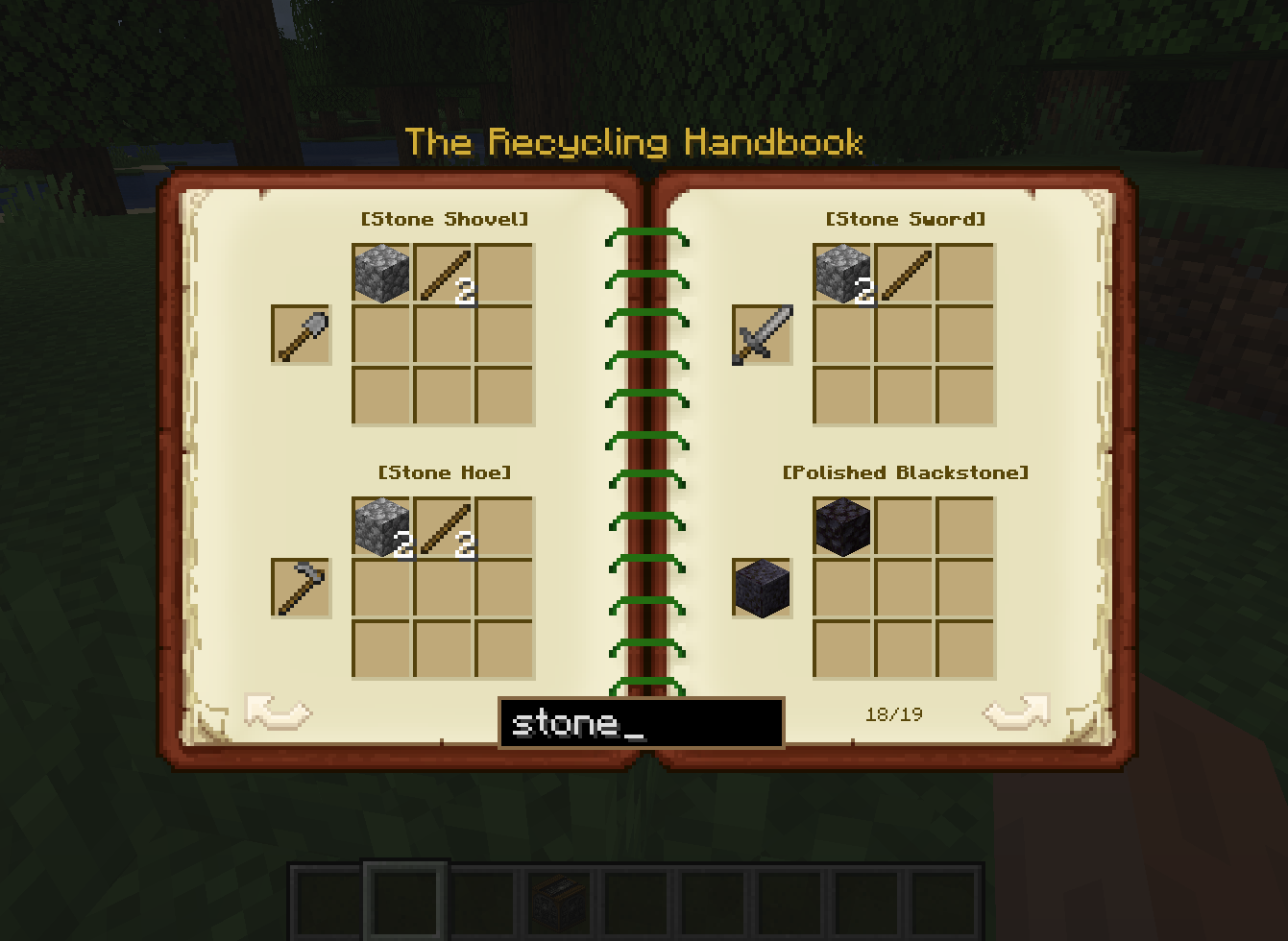 Рецепты существуют только на сервере и полностью настраиваются в json-файлах в папке config (также проверяет config), и могут быть изменены в игре с помощью команды /recycler, или непосредственно с помощью кнопок discovery/remove в графическом интерфейсе Recycler для /op с уровнем разрешения 2+ (creative mode в одиночной игре).
