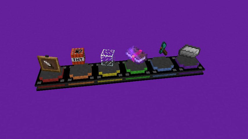 Акцентный цвет, название и вращающийся предмет, который они отображают, полностью настраиваются автором модпака или оператором сервера. Есть два способа сделать это - ручное редактирование NBT является одним из вариантов, но если вы не хотите этого делать, вы можете создавать их в игре в Creative mode с... относительно интуитивными взаимодействиями: правые клики и переименование в наковальне.