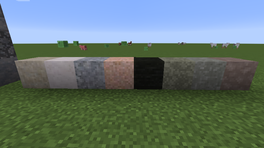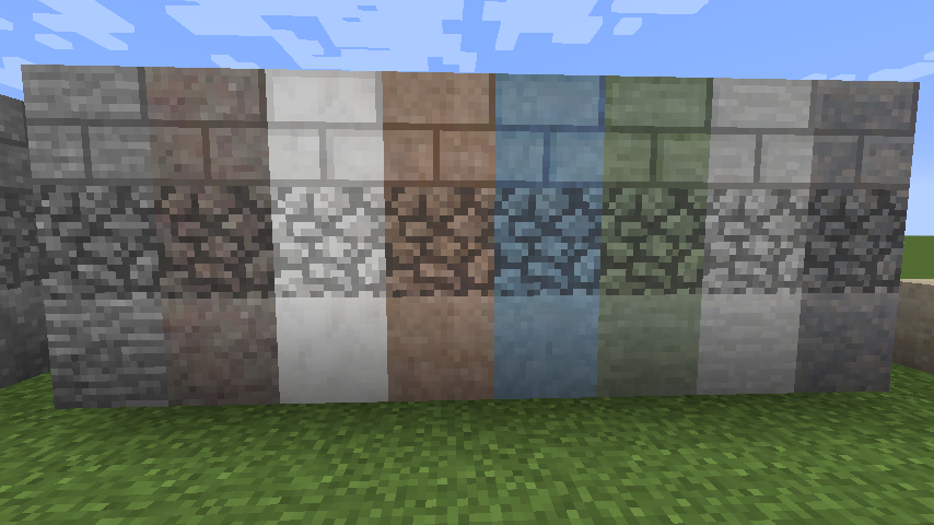 • Эти 24 варианта также представлены в виде булыжника, гравия, песка, песчаника, глины, яиц монстров, заросшего камня, кирпичей, замшелых кирпичей и булыжника, плит, стен, ступеней и кнопок.