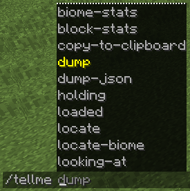 - Примечание: Начиная с версии 0.4.0, эти опции удалены. Просто выполните /tellme biome, чтобы получить информацию о текущем биоме. Список всех биомов теперь получается с помощью команд /tellme dump biomes или /tellme list biomes.